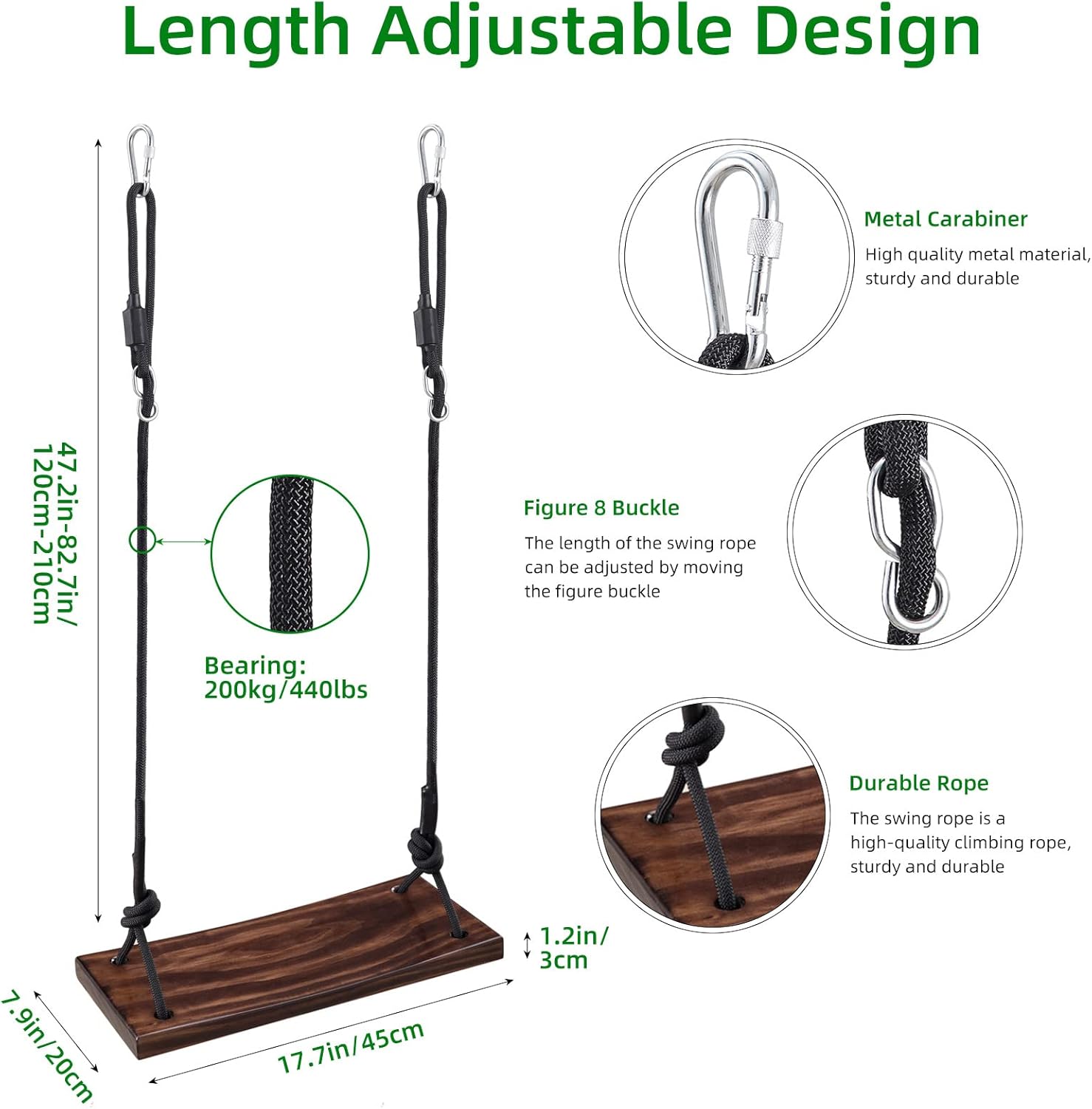 - Schaukel im Innen- und Aussenbereich: Die maximale Traglast der hängenden Baumschaukel beträgt 200 kg/440lbs, Sitzgrösse: 45 x 20 x 3 cm/17,7 x 7,9 x 1,2 Zoll, grosser Schaukelsitz für Kinder und Erwachsene. Es ist sehr sicher für Sie und Ihre Familie .120 cm - 210 cm/47,2-82,7 Zoll verstellbares Seil, verzinkte Metallringe und Beschläge Kann auch an einem Ast oder Balken aufgehängt werden. Für Innen und Aussenbereich Kinder Garten Schaukel.