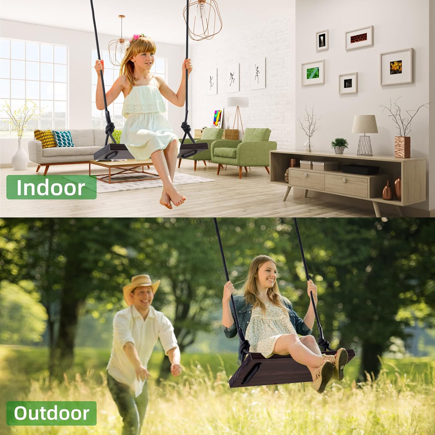 - Dies ist die neueste Schaukel, die von PELLOR entwickelt und entworfen wurde. Diese Holzschaukel hat ein ergonomisch geschwungenes Design, das nicht nur sicher ist, sondern auch dafür sorgt, dass wir uns beim Sitzen wohler fühlen. Und die neue Kombination macht die Schaukel sehr spielbar und für mehr Szenen geeignet. Die Baumschaukel im Freien ist die perfekte Wahl, um Ihre kindliche Unschuld zu befriedigen. Ob Hinterhof, Veranda, Terrasse, Garten, Park oder Zuhause, Ihr Kinderspielplatz.