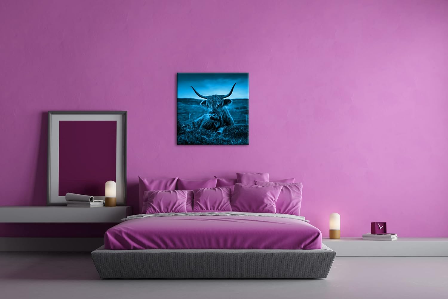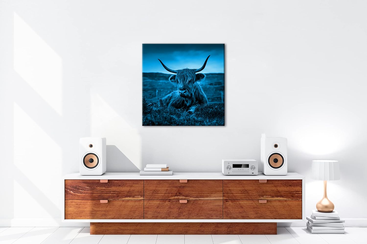deyoli pelziges Rind auf schottischer Landschaft Format: 60x60 Effekt: Monocrome Blau als Leinwandbi