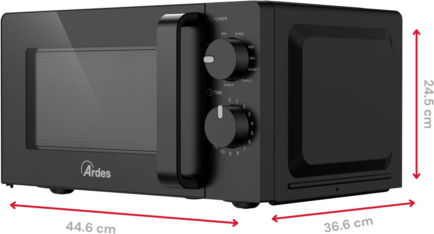 • ABMESSUNGEN UND EIGENSCHAFTEN - Der kleine Mikrowellenherd Ardes hat ein Fassungsvermögen von 20 Litern und eine Grösse von 44,6cm x 36,6cm x 24,5 cm. Der interne Teller hat einen Durchmesser von 24,5cm