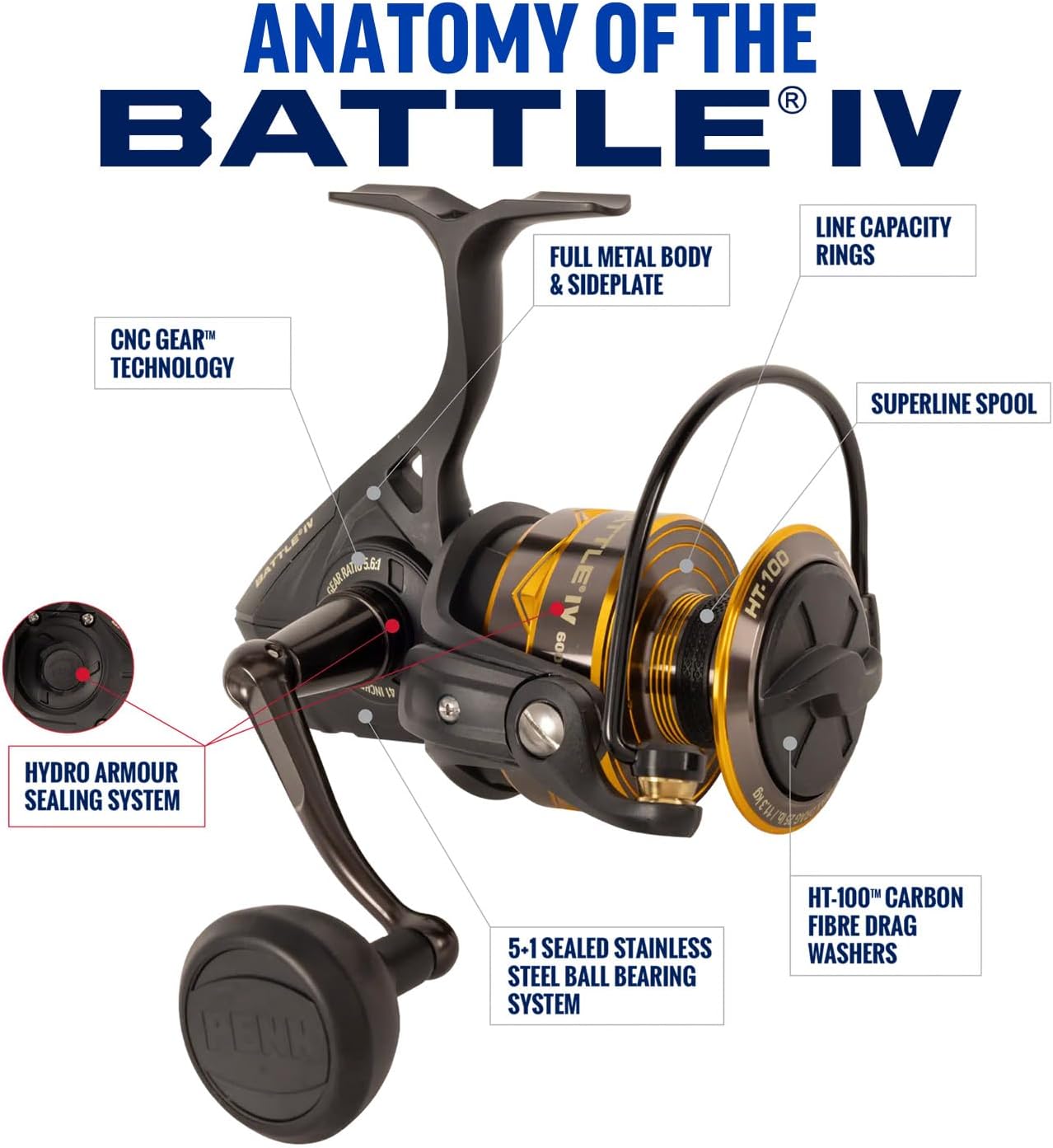 - Penn Battle Spinnangelrolle in Grösse 2000: Stärker und langlebiger als je zuvor, die Penn Battle-IV-Spinnangelrolle ist gebaut, um grosse Salzwasser-Wildfische zu bewältigen.