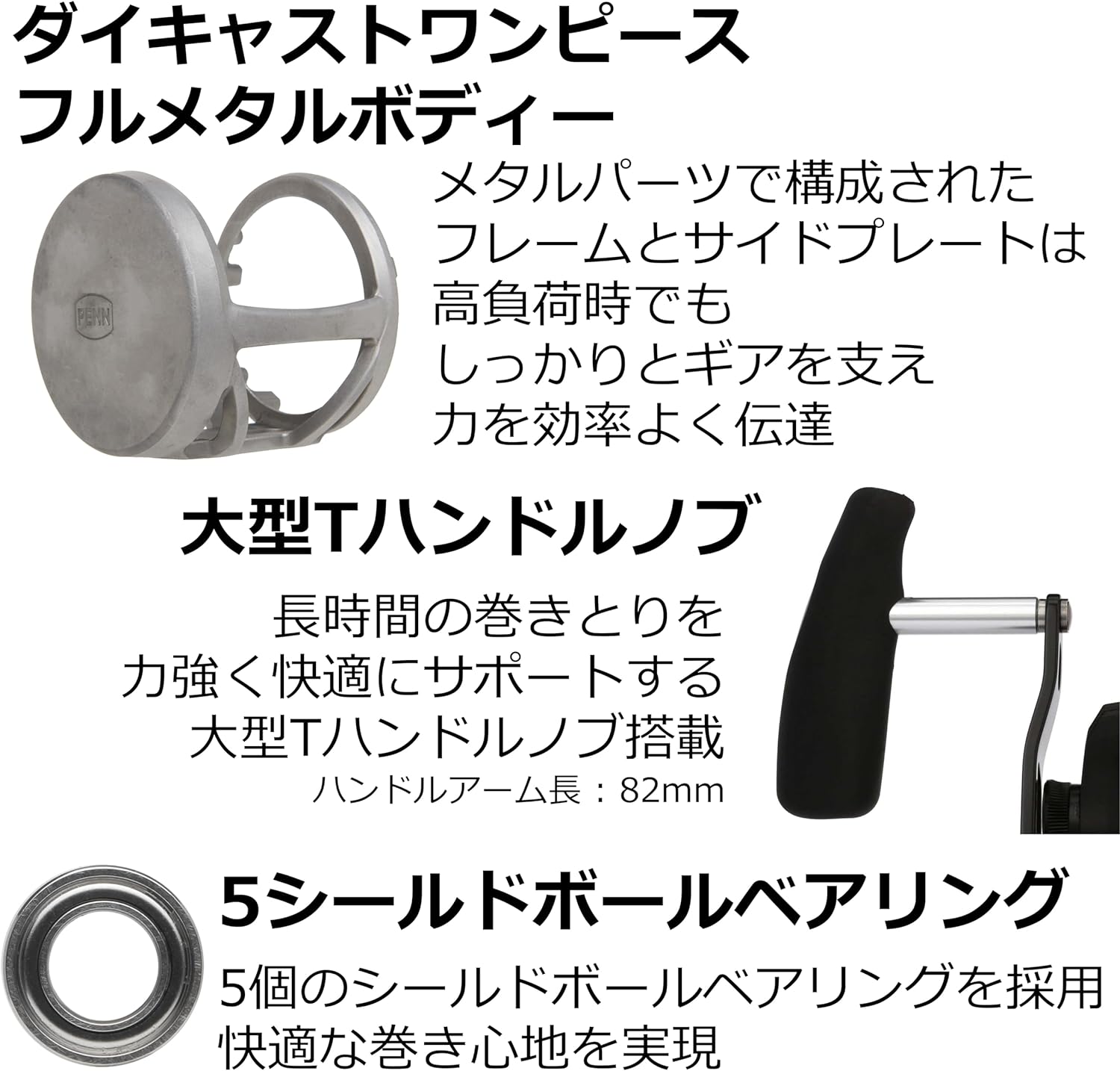 - Dura-Drag(TM)-System, Haupt- und Ritzelgetriebe aus Edelstahl, Pull-To-Turn Voreinstellknopf verhindert versehentliche Änderungen der Zugkraft, Geschmiedete und bearbeitete Aluminiumspule, Quick-Shift II(TM) 2-Gang-System
