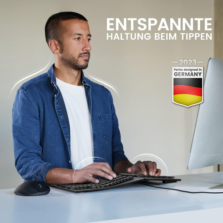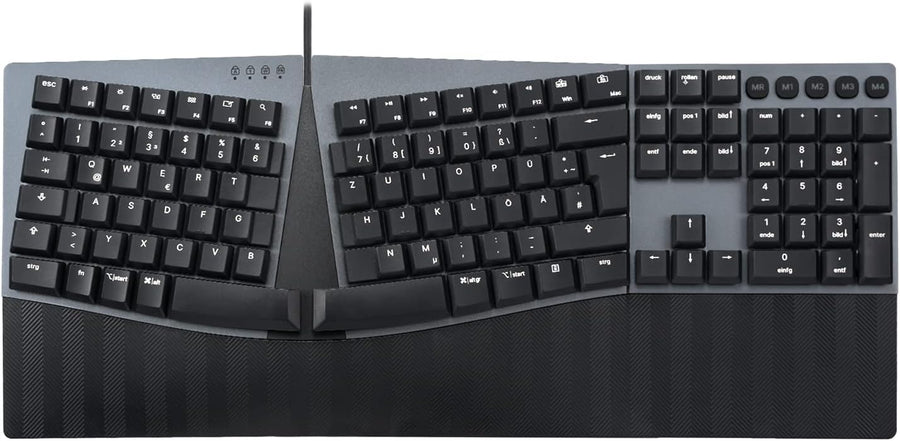 - Tastatur in voller Grösse mit ergonomischem Design: Die Tastatur in voller Grösse mit geteiltem Tastendesign und gebogenem Rahmen fördert eine bessere Körperhaltung, indem sie hilft, das Handgelenk und die Arme in der natürlichsten Schreibhaltung zu