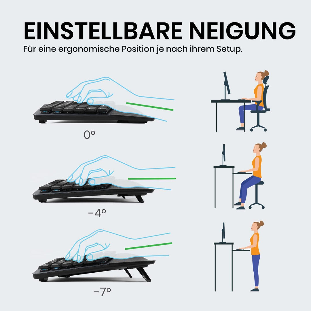 - Einstellbare Neigung Handgelenkauflage: Die integrierte Handflächenauflage stützt die Handfläche und das Handgelenk und korrigiert die Pronation des Handgelenks während des Tippens, um unerwünschten Druck und Muskelbelastungen zu vermeiden. Mit den