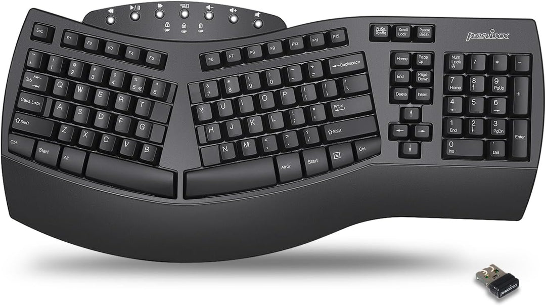 - ERGONOMIC SPLIT-KEY DESIGN: Integrated palm rest supports your wrists, releases median nerve pressure and reduces forearm tension; Natural arm and hand position while typing to minimize chances of RSI, carpal tunnel syndrome