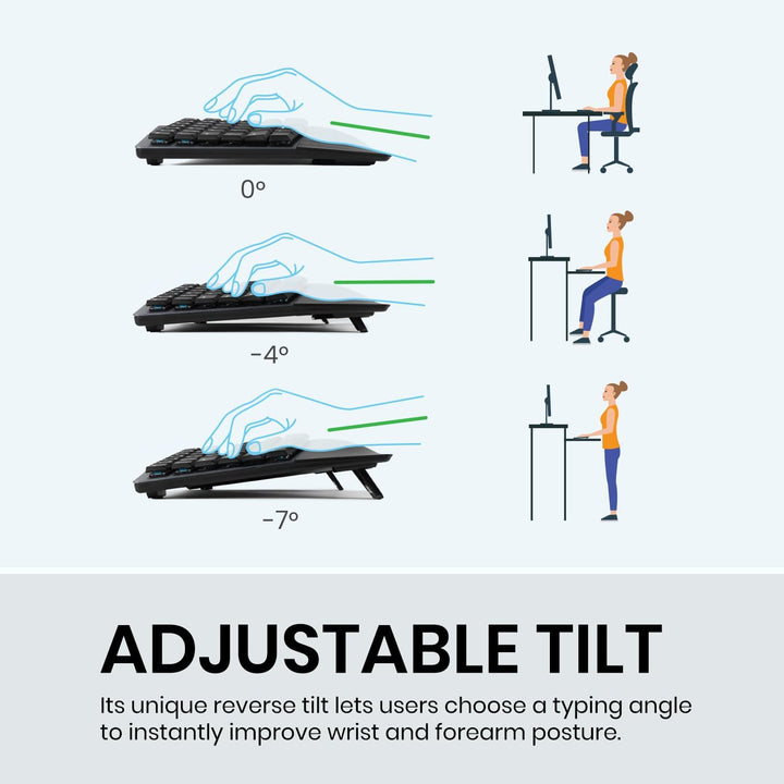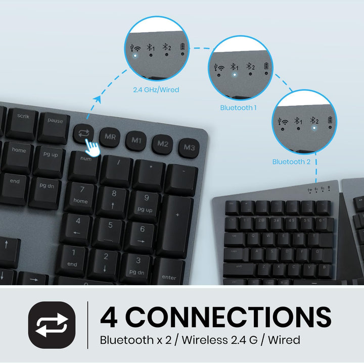 - Multi-device spec with wired, wireless 2.4G, and 2 Bluetooth ID setups. An ergonomic Full-size keyboard with a split-key design and curved frame promotes a better posture by helping to position the wrist and arms in the most natural typing posture