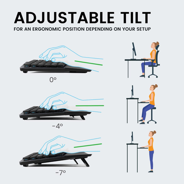- Verstellbare Neigung Handgelenkauflage: Die integrierte Handballenauflage unterstützt Handfläche und Handgelenk und korrigiert gleichzeitig die Handgelenkpronation beim Tippen, um unerwünschten Druck und Muskelzerrungen mit 0, -4 und -7 Grad zu