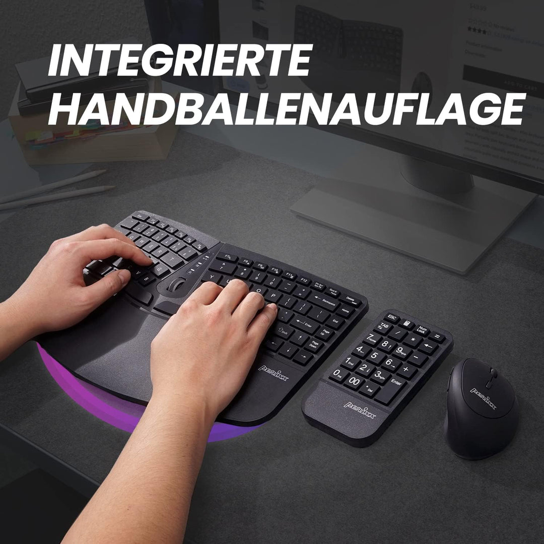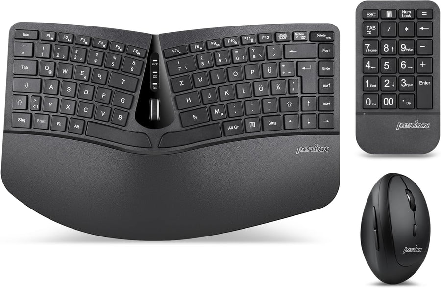 - ERGONOMISCHES KOMPAKTES DESKTOP SET - Ein preiswertes, kompaktes Desktop-Set mit ergonomischem Design; Kompakte, geteilte Tastatur mit separatem Ziffernblock und einer vertikalen Maus; Reduziert den Druck von Ihren Händen während des Arbeitens und gibt