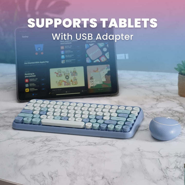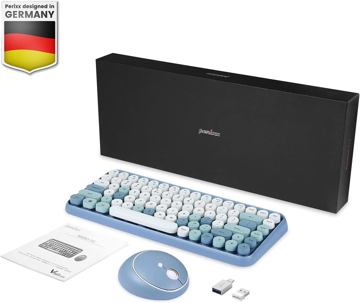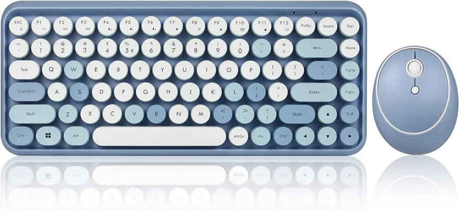 - Stylish Desktop Set: A compact keyboard and mouse in shades of blue; with one receiver for both products; Vintage style keyboard with typewriter-inspired keys and a rounded mouse; Keyboard Dimensions: 12.60 x 5.40 x 1.18 inches; Mouse Dimensions: 2.95 x
