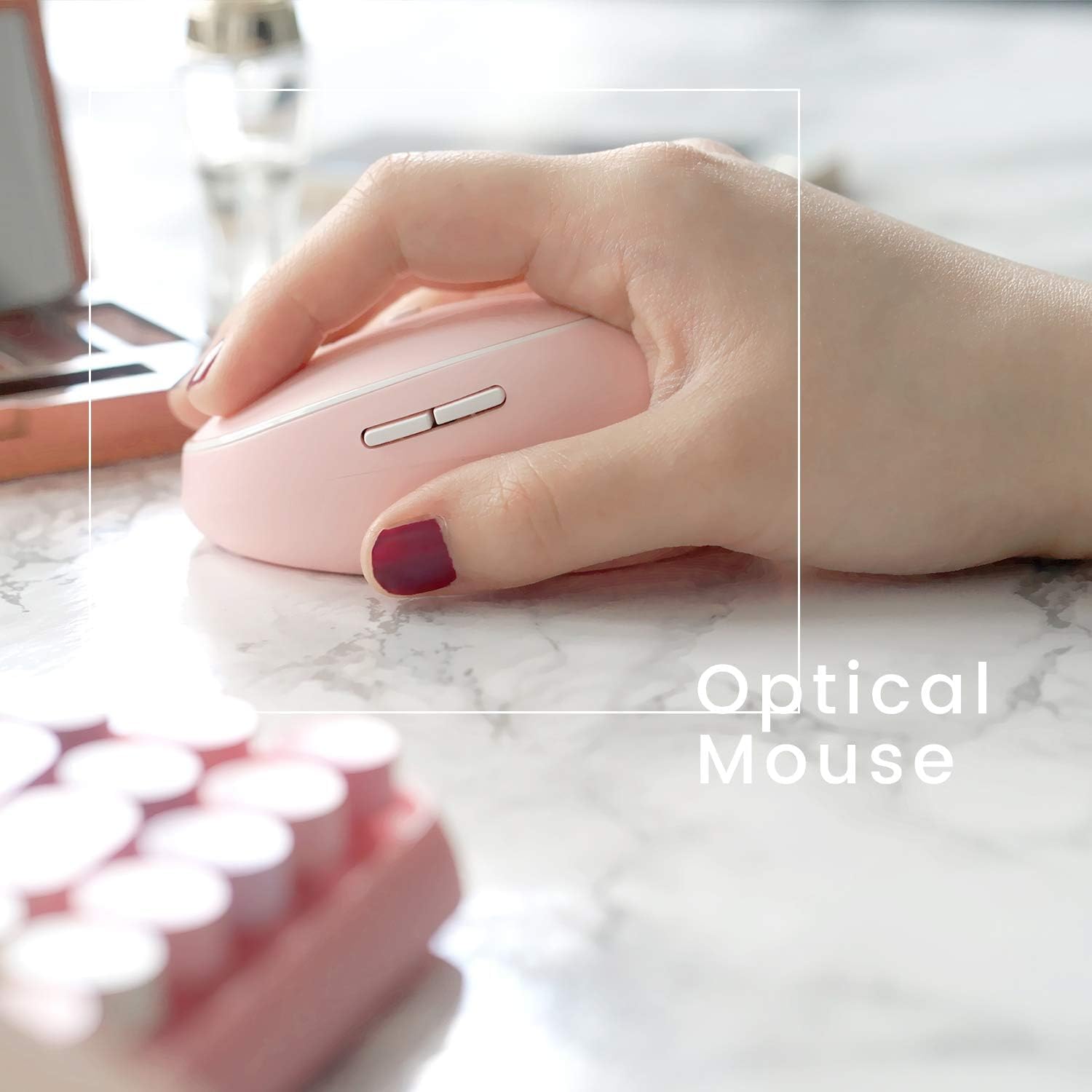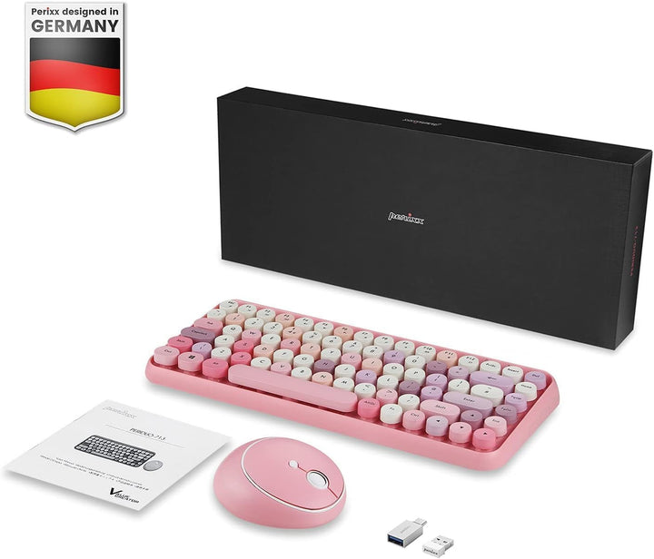 - Stylish Desktop Set - A compact keyboard and mouse in shades of pink, purple, and white color range; with one receiver for both products; Vintage style keyboard with typewriter-inspired keys and a rounded mouse; Keyboard Dimensions: 320 x 137 x 30 mm;