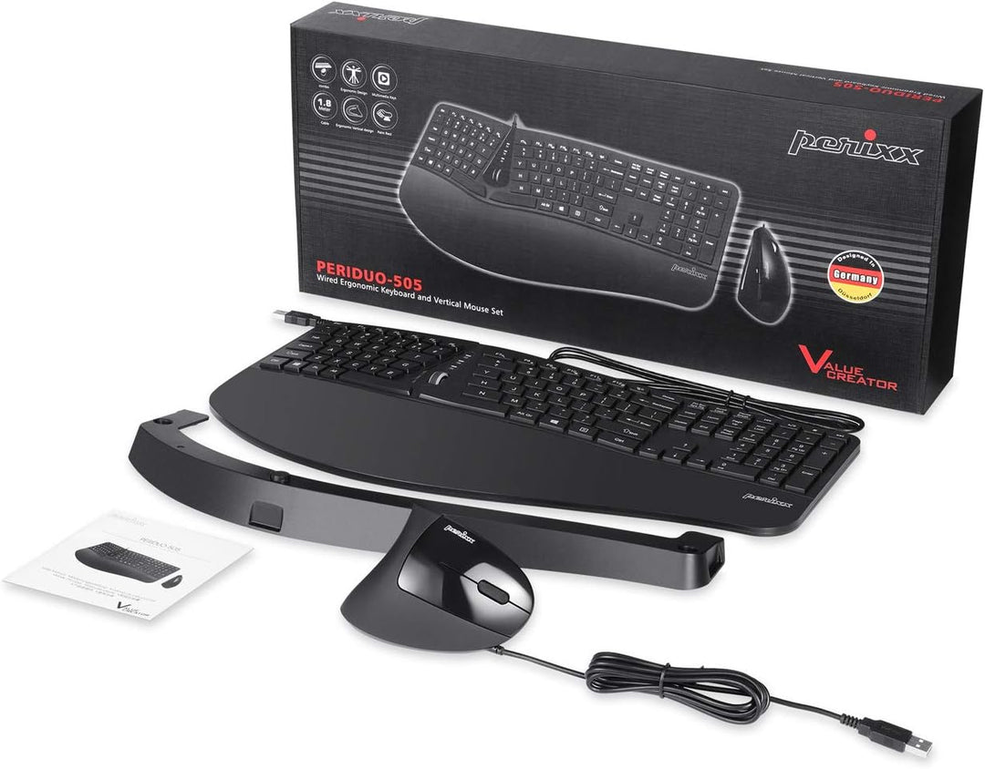 - Vertikale Maus: Kabelgebundene Maus, vertikales ergonomisches Design mit 5 Tasten und einstellbarer Auflösung von 1000 / 1600 dpi; Kabellänge von Tastatur und Maus 1,8 m.