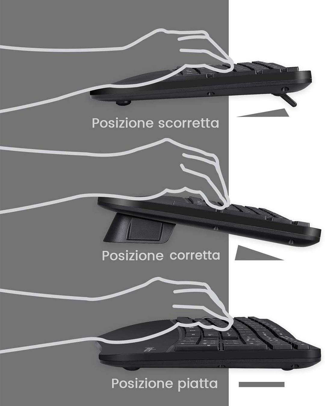 - Mit seiner schlanken, natürlichen Bogenform und der integrierten verstellbaren Handgelenkstütze, die eine neutrale Handgelenkhaltung fördert, um Karpaltunnelsyndrom und RSI-Syndrom zu verhindern.