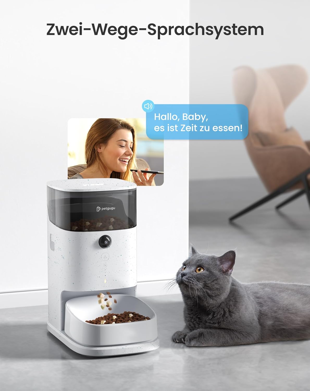 - Ferninteraktion: Interagieren Sie aus der Ferne mit Ihren Haustieren und füttern Sie sie. Teilen Sie das App-Konto mit der Familie, um gemeinsam mit den Haustieren verbunden zu bleiben. Passen Sie die Sprachaufnahmen an, um Ihr Haustier zu rufen, mit