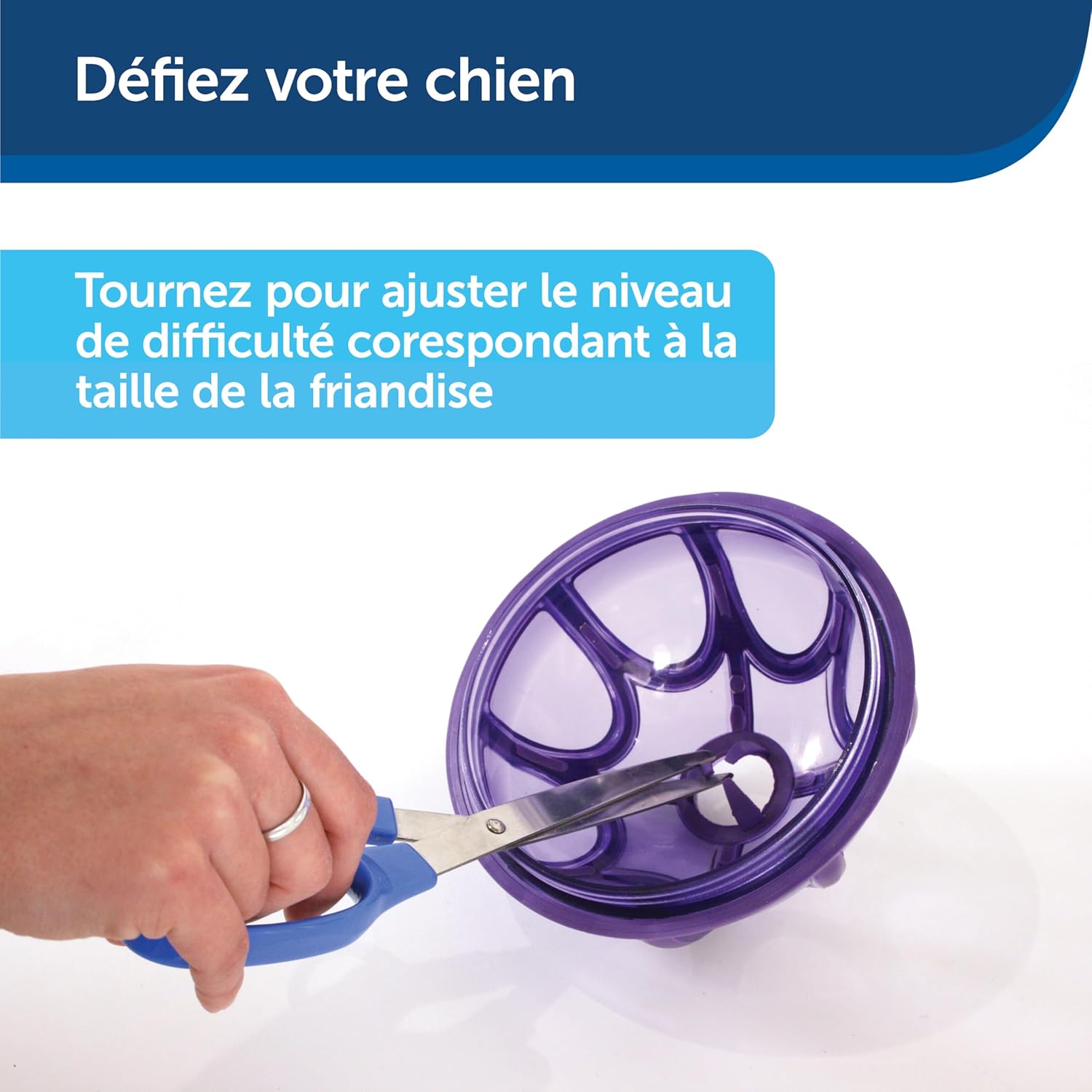 - Anpassbare Leckerliausgabe – Die patentierte Treat Meter Dosiervorrichtung gibt beim Spielen willkürlich Leckerlis bzw. Trockenfutter aus. Zur schnelleren Ausgabe die Kautschukfinger etwas kürzen