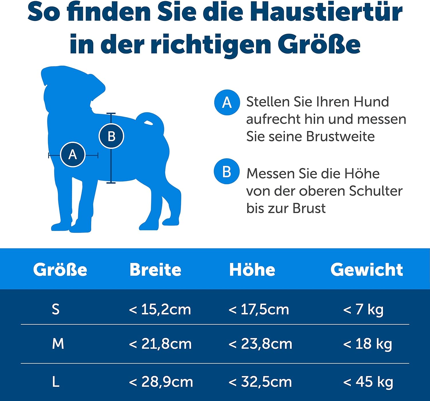 - MAẞE: Die Masse des Rahmens der Hundeklappe L betragen: 45, 60 cm x 38, 60 cm; maximale Schulterbreite des Hundes: 29 cm. Sie ist für grosse Hunde bis zu 45 kg geeignet