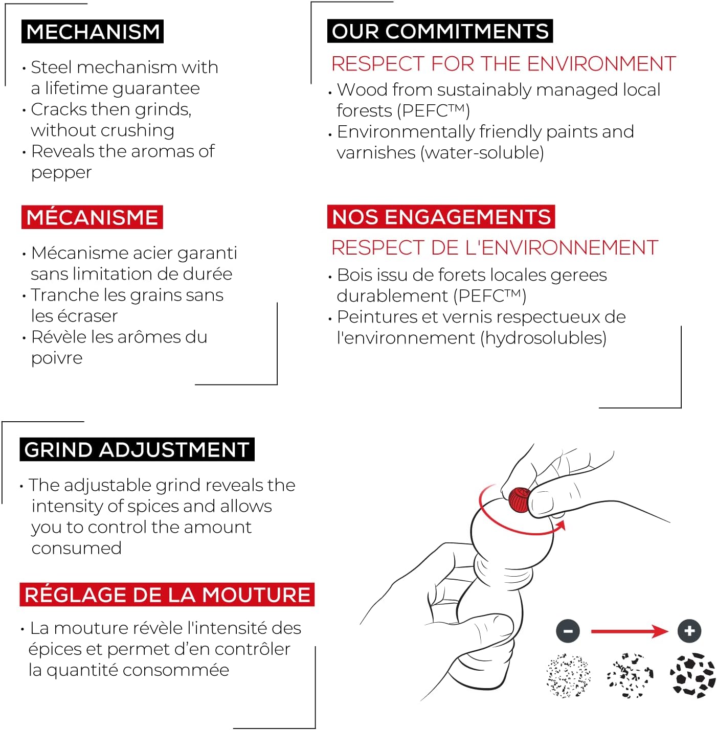 - Nicht geeignet für Salz, Reinigung ausschliesslich mit trockenem, weichem Tuch, Herstellergarantie auf Gehäuse (5 Jahre) und Mahlwerk (25 Jahre), Made in France