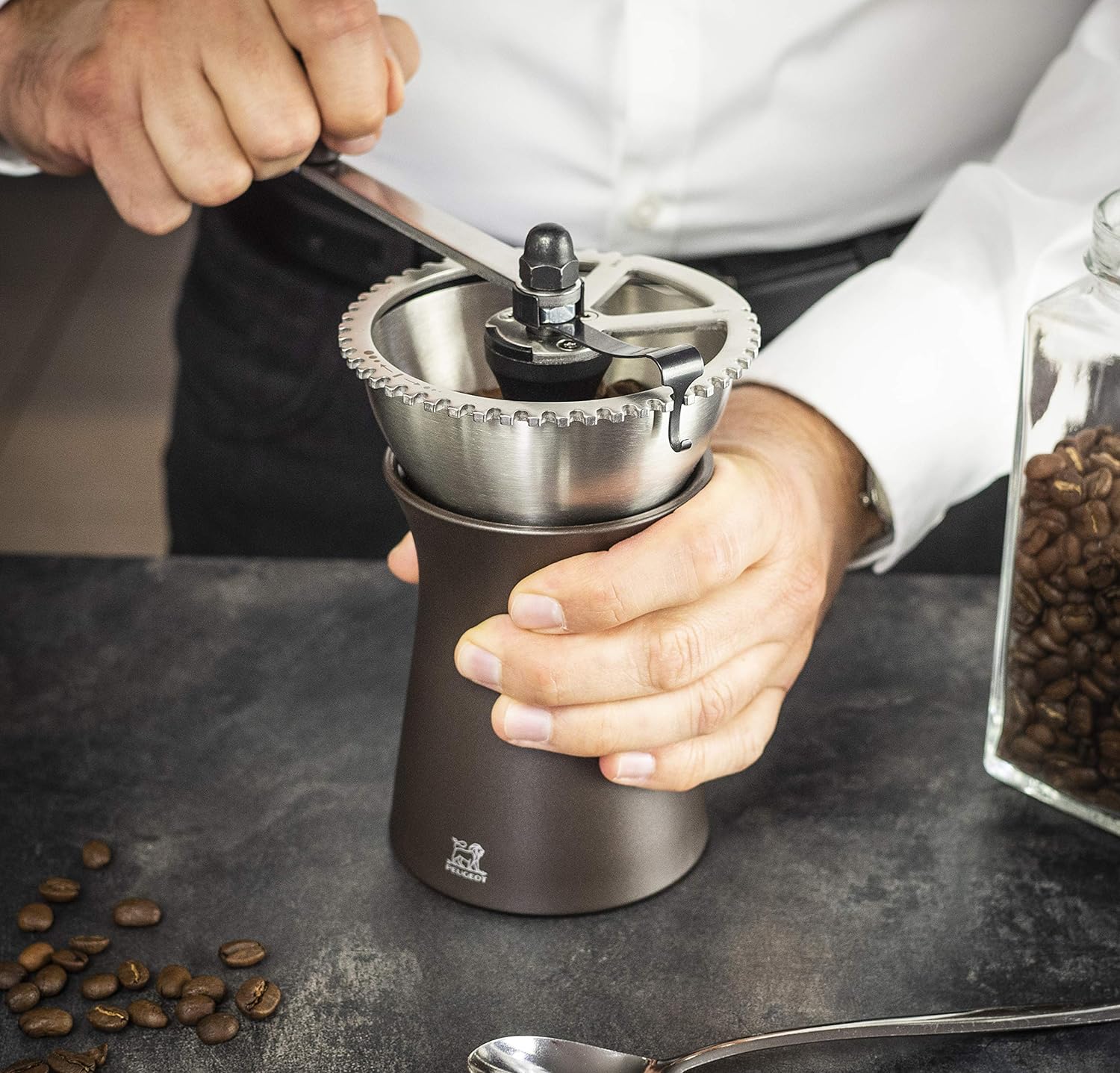 - HAND-KAFFEEMÜHLE PEUGEOT: Die Peugeot Mühle Kronos aus hochwertigem Edelstahl & robustem Kunststoff ist ein traditionelles Modell im Retro-Stil mit Kurbel und Auffangbehälter