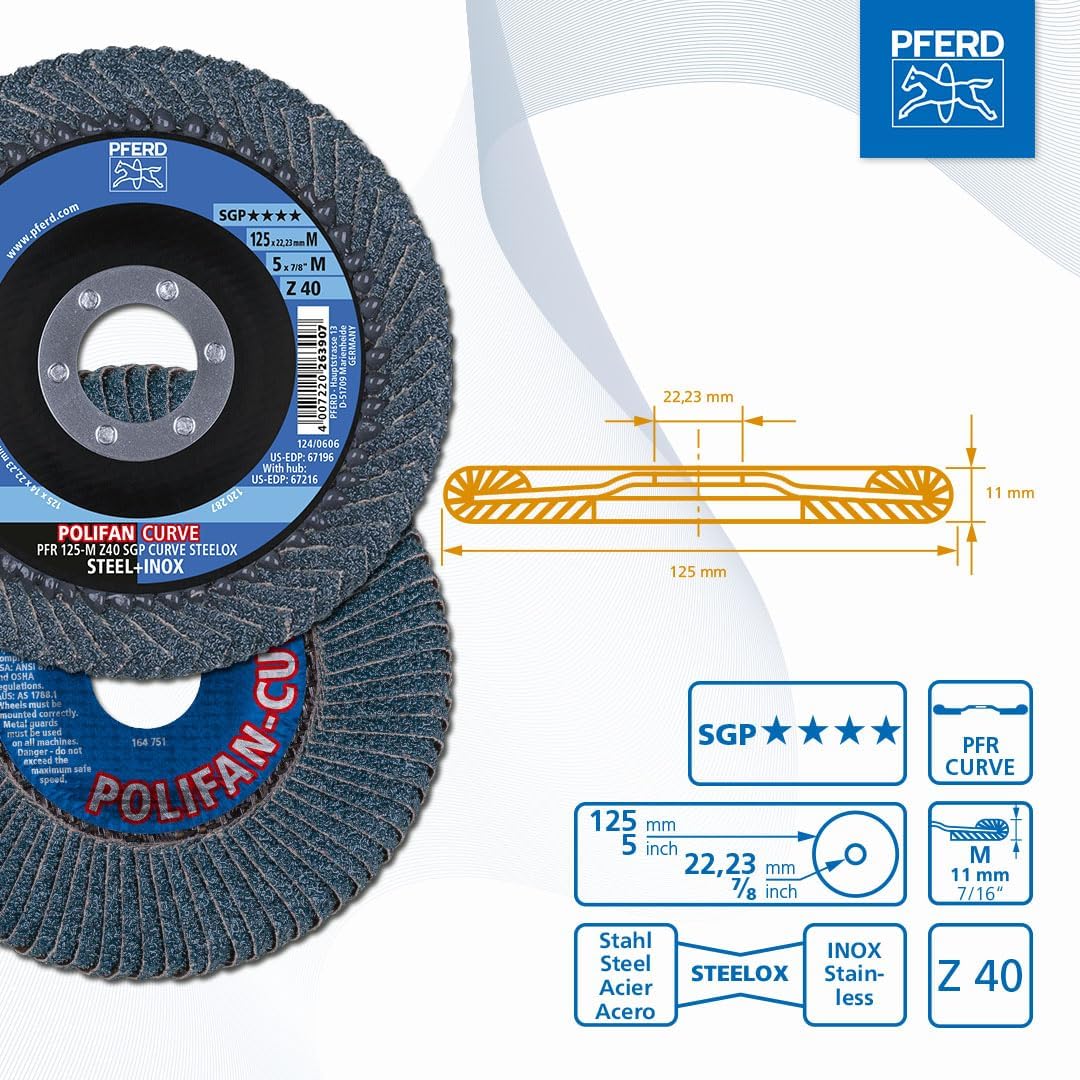 - Lieferumfang: 2 x POLIFAN-Fächerscheibe SGP CURVE STEELOX von PFERD / Mit Durchmesser 125mm, Breite M (11mm) und Bohrung 22,23mm / radiale Ausführung PFR / Schleifmittel Zirkonkorund Z / Korngrösse 40