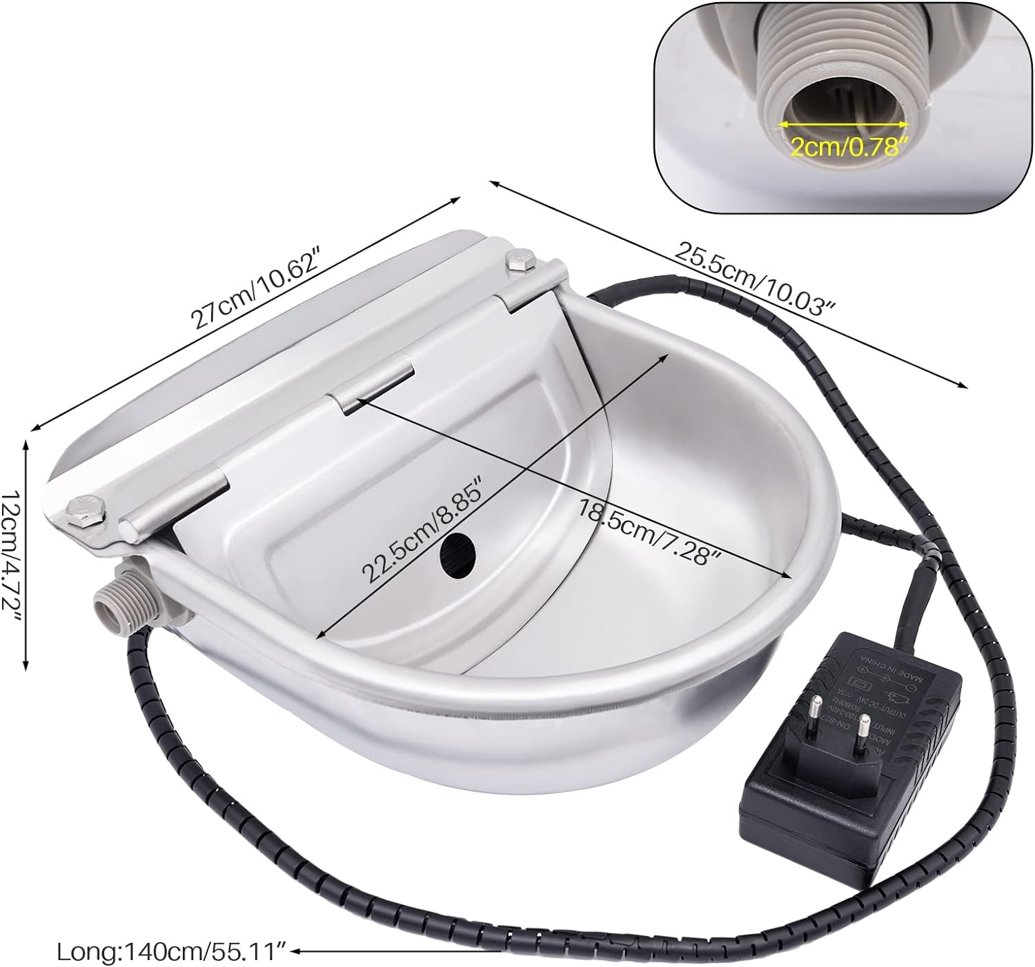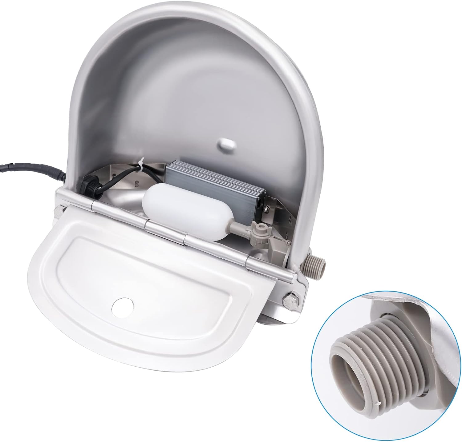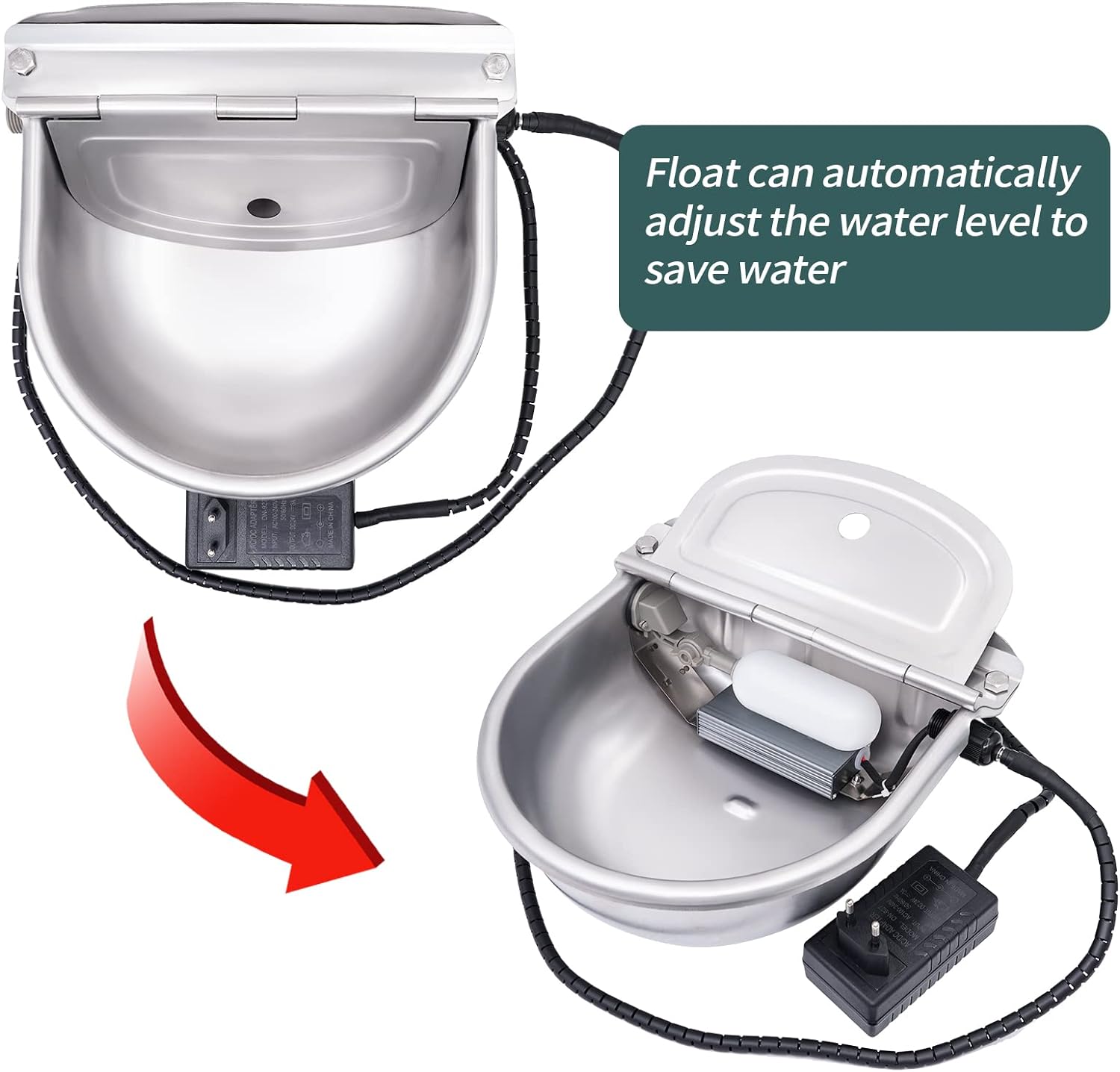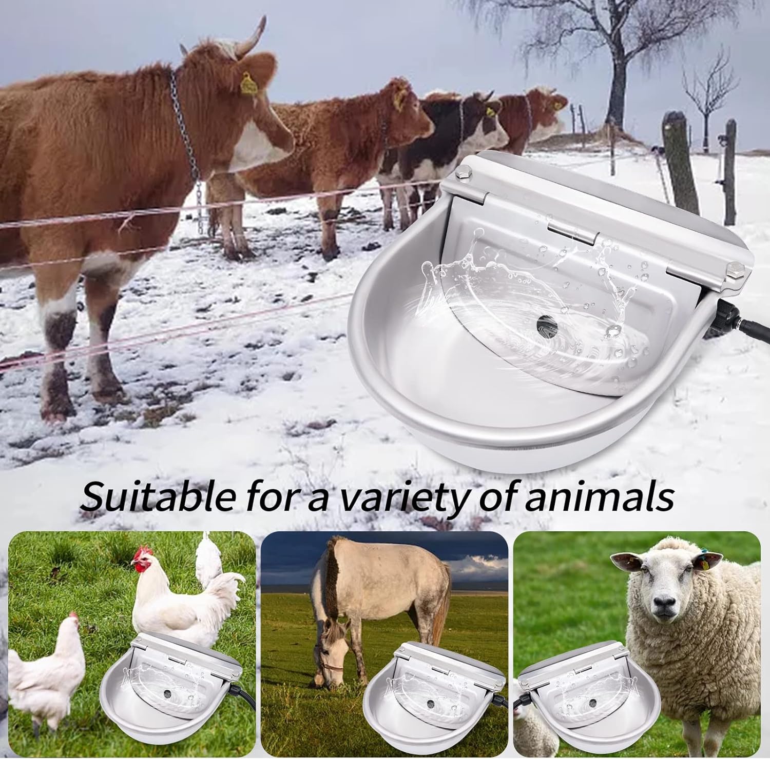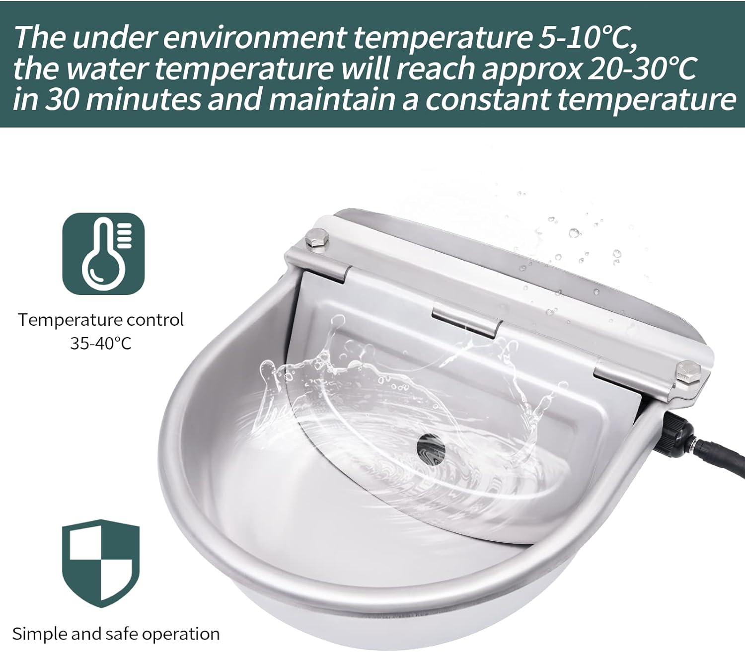 - AUTOMATISCHER THERMOSTAT: Der automatische Viehtrog ist thermostatisch gesteuert und für kaltes Winterwetter ausgelegt, insbesondere wenn es schneit, und hält die Temperatur um 20 ℃ ~ 30 ℃. Wenn die Temperatur ansteigtca. +30 °C, die Tränke