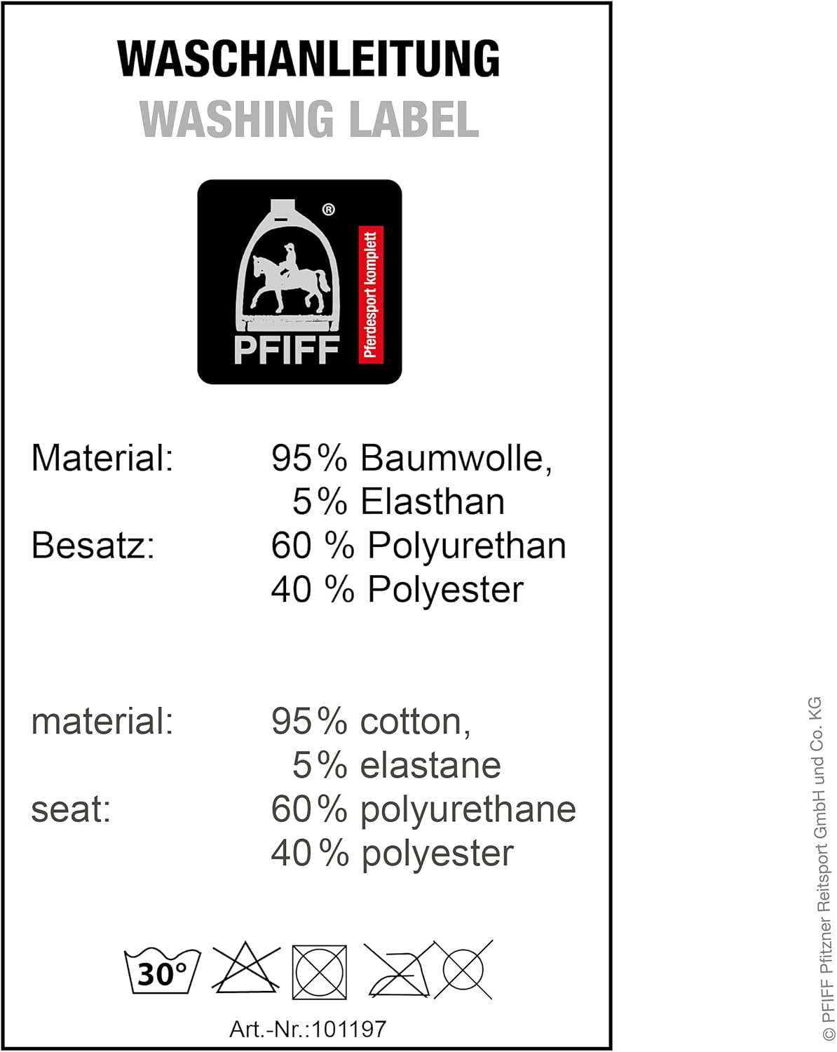 PRODUKTBESCHREIBUNGEN Die PFIFF Vollbesatzreithose für Damen ist eine eher lang geschnittene, sportliche und elegante Reithose. Die Hose ist aus einem Baumwoll-Elasthan-Fasergemisch und daher super elastisch. Sie hat einen waschbaren Vollbesatz, strapazierbare Gürtelschlaufen und eine Reissverschlusstasche. Ein Qualitätsprodukt von Pfiff. Material: 95 % Baumwolle, 5 % Elasthan; Besatz: 60 % Polyurethan, 40 % Polyester; waschbar bis 30 °C Mehr
