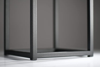 - Geschweisste Rahmenstruktur, gebeizter MDF-Topf, natürliches Eichenfurnier. Inklusive Kunststoffeinsatz für quadratische Blumentöpfe.