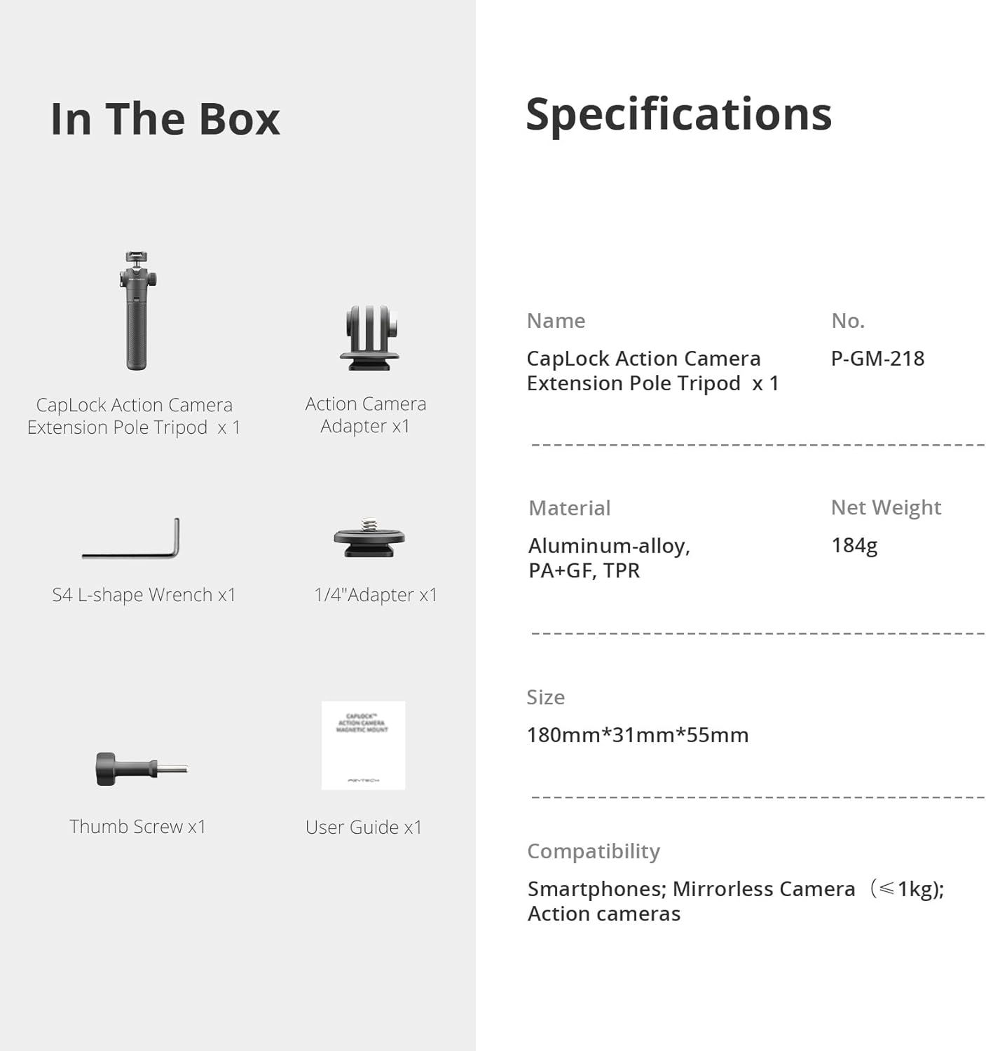 - 【Schnellverschluss-System】 Das PGYTECH CapLock System eliminiert den mühsamen Prozess des Drehens und Entfernens traditioneller Sportkamera-Schnittstellenknöpfe und ermöglicht eine Installation in nur einem Schritt, und das Dual-Lock-Design