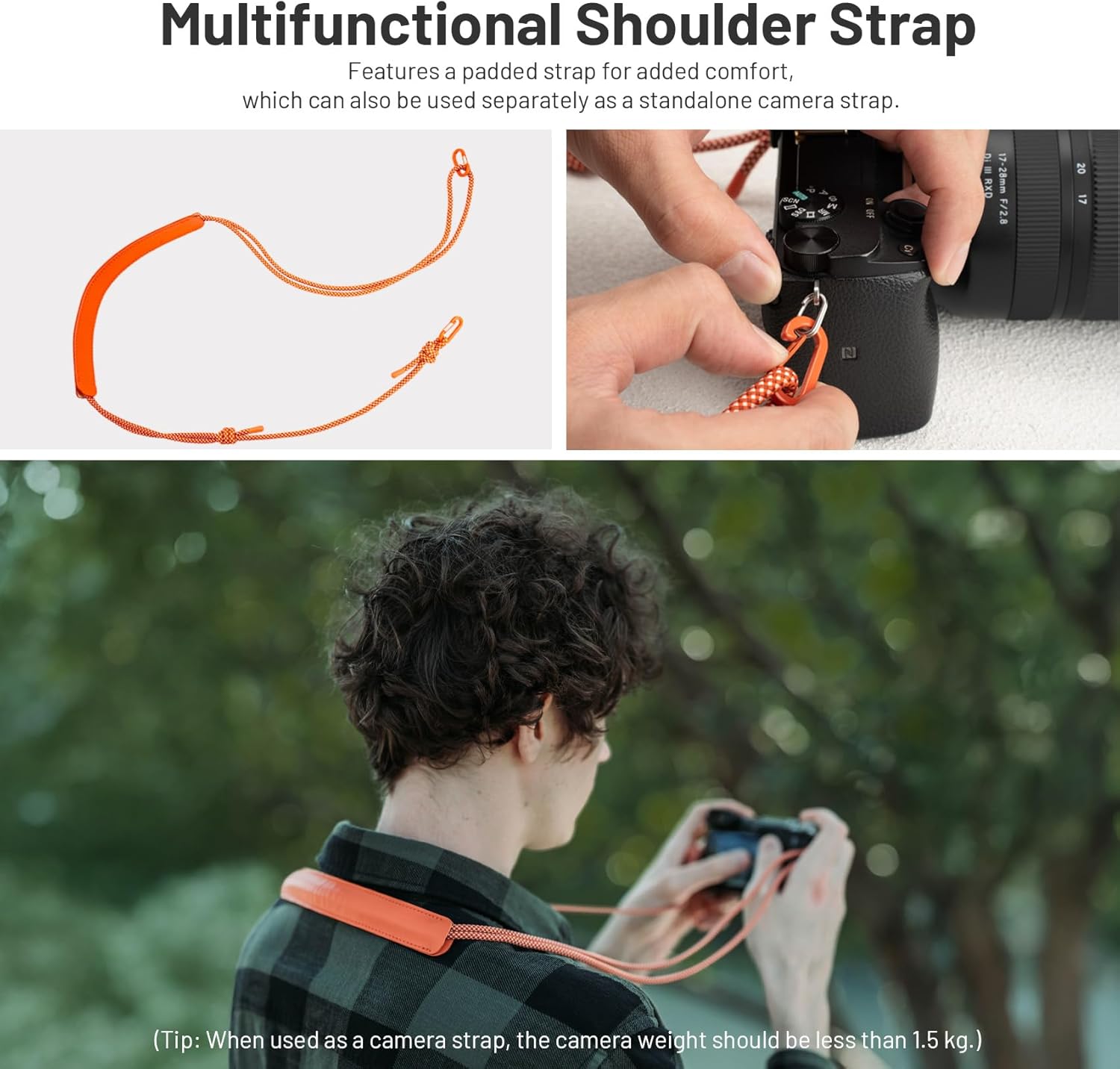 - 【Abnehmbarer Gurt】Der Gurt ist von 111–120 cm verstellbar, passend für Nutzer unterschiedlicher Grösse und Trageweise. Er kann auch abgenommen und als eigenständiger Kameragurt verwendet werden (empfohlen für Kameras bis 1,5 kg für sichere und