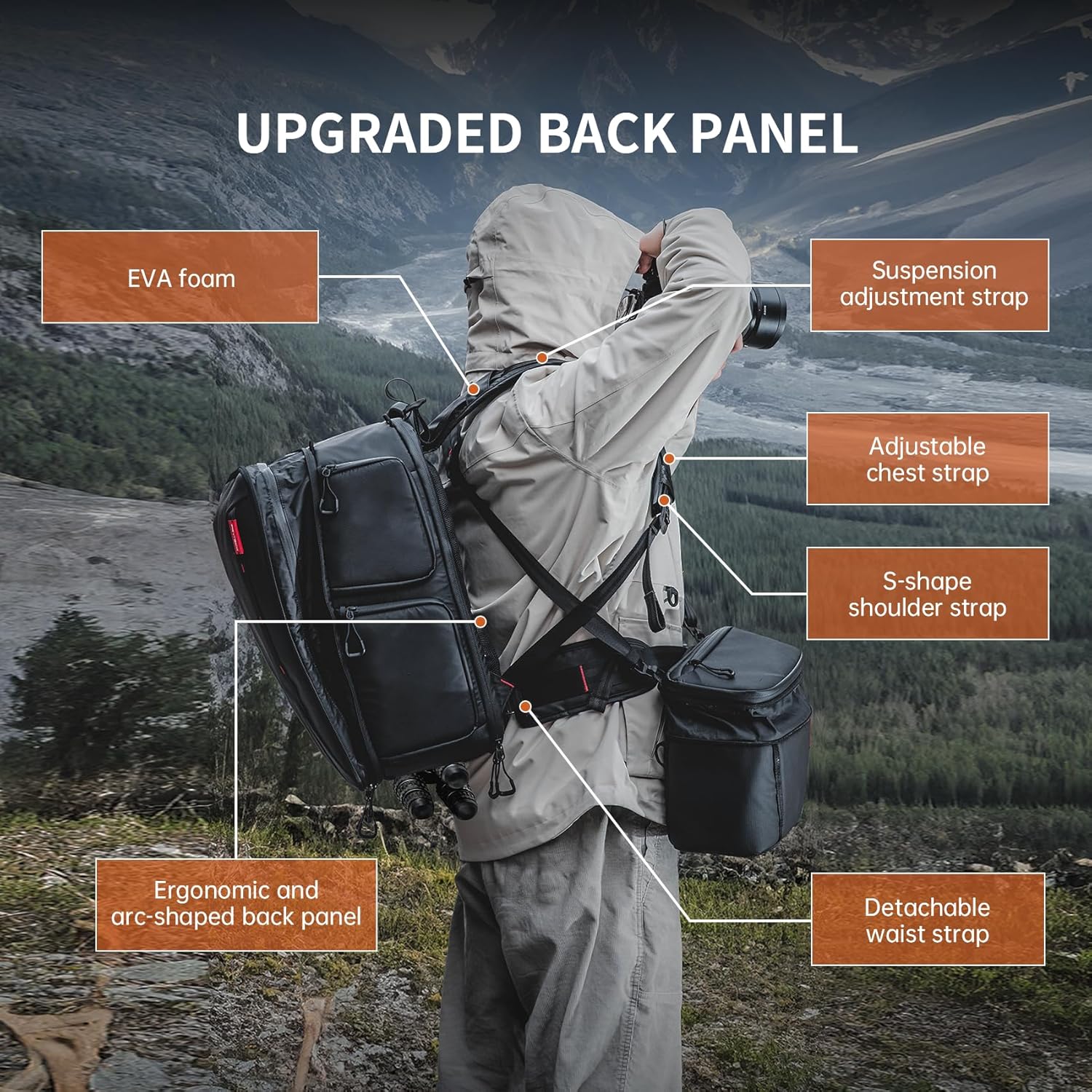 - Grosse Kapazität: 25L grosser Fotorucksack mit erweiterbarem 5- 8L Frontfach kann perfekt 2 Kameras+5 Objektive (einschliesslich eines 200-600-Objektivs) oder 2 Kameras+6-Objektive (einschliesslich eines 70-200-Objektivs), kompatibel mit Sony/Canon/