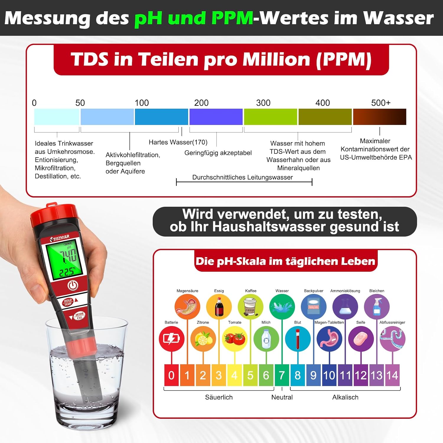 - Vielseitiges 4-in-1 Wasser pH Messgerät: Profitieren Sie von der Vielseitigkeit unseres 4-in-1-pH-Messgeräts mit Funktionen für pH, TDS, EC und Temperatur. Ideal für eine breite Palette von Anwendungen, darunter Hydrokulturen, Gewächshausreservoirs,