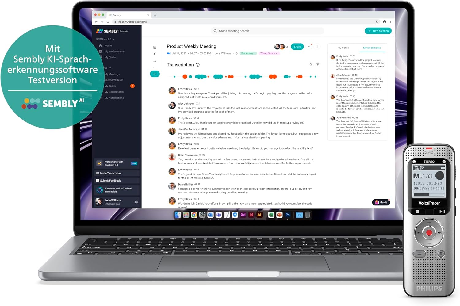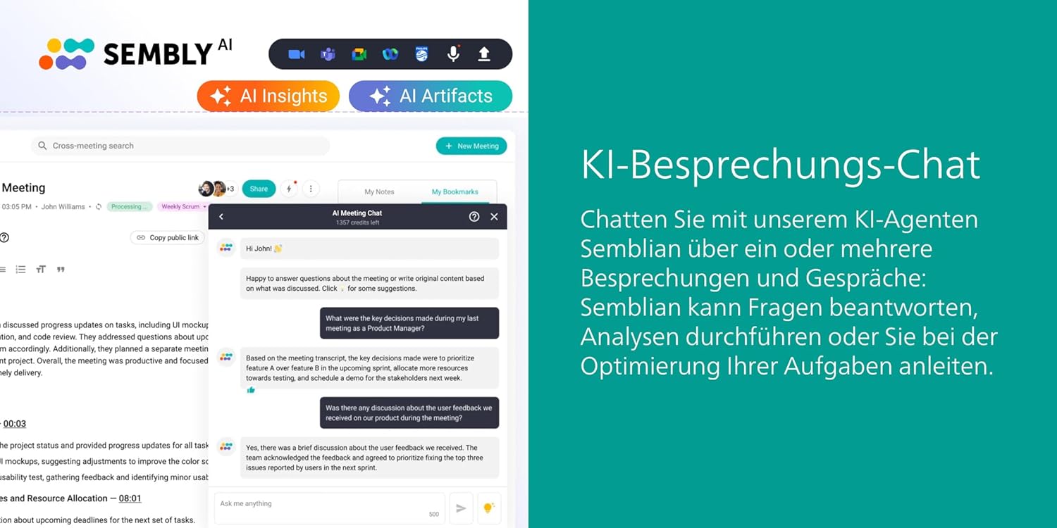 - Sembly AI erkennt automatisch wichtige Aufgaben, Entscheidungen und Fristen – damit nichts vergessen wird. Inklusive KI-gestütztem Chat-Assistenten für fundierte Besprechungseinblicke