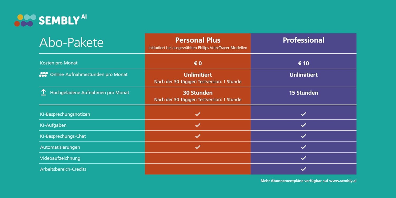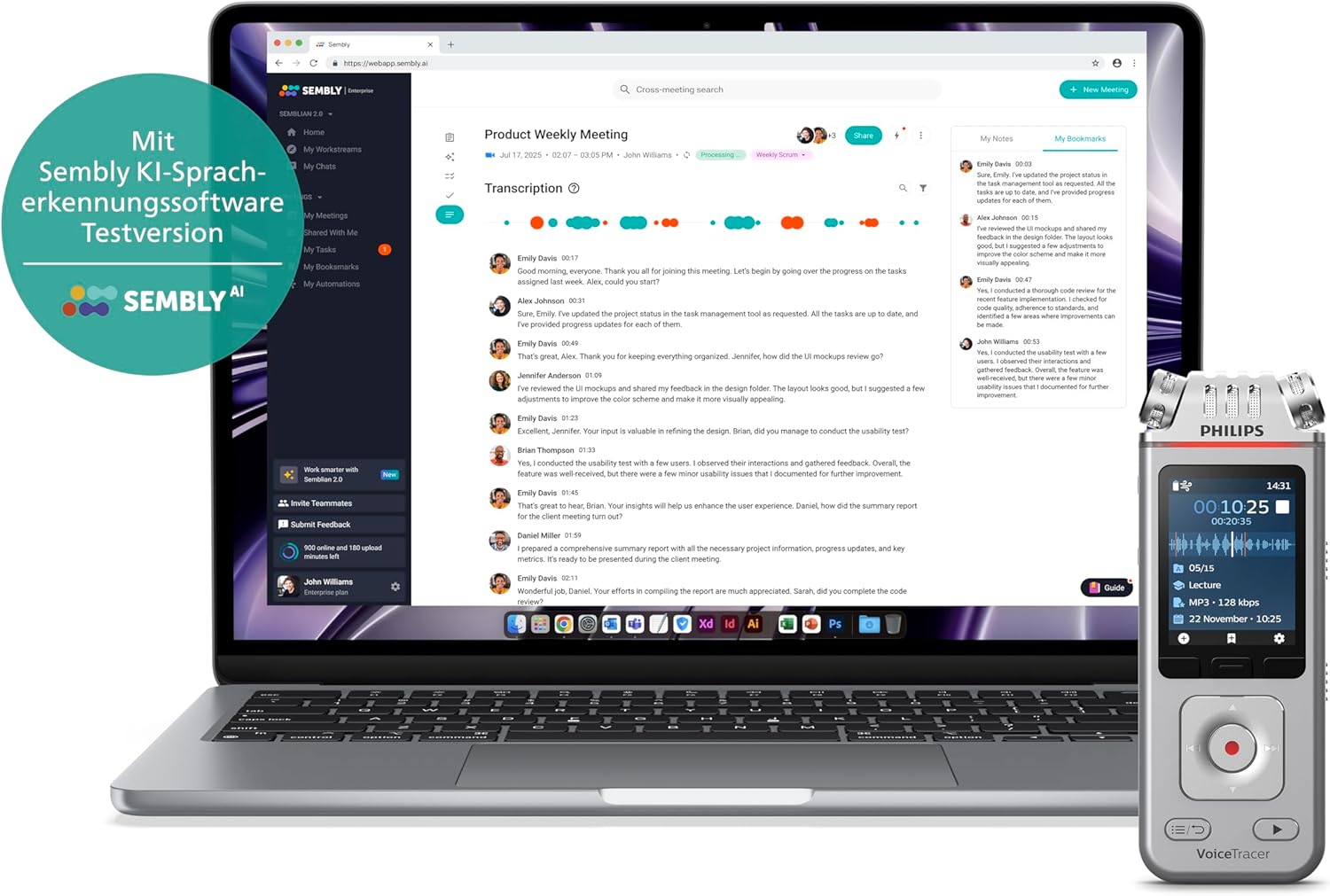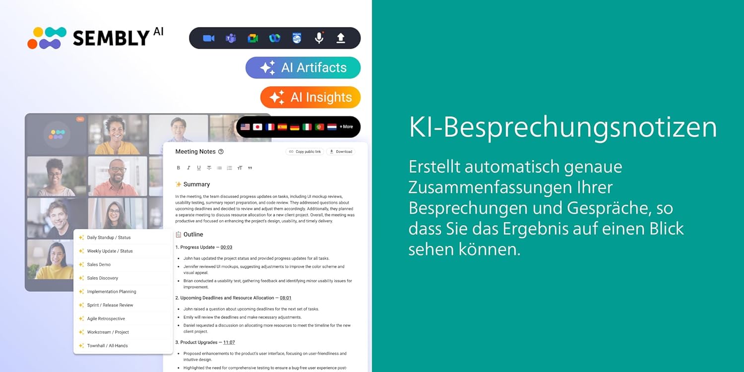 - Sembly AI erkennt automatisch wichtige Aufgaben, Entscheidungen und Fristen – damit nichts vergessen wird, Inklusive KI-gestütztem Chat-Assistenten für fundierte Besprechungseinblicke