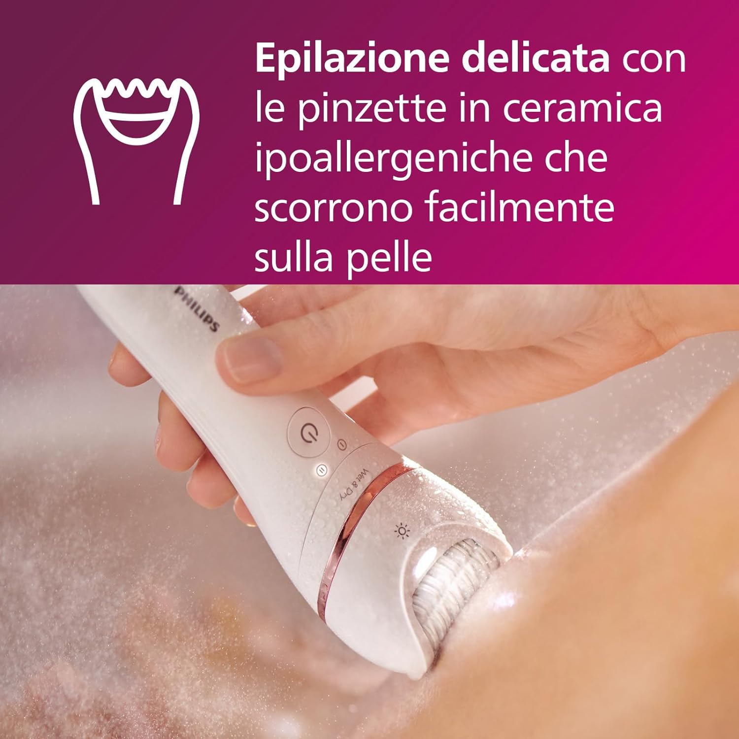 - Lieferumfang: 1 Philips Series 8000 Epilierer, nass und trocken, mit 6 Ausätzen, Rasiererkopf