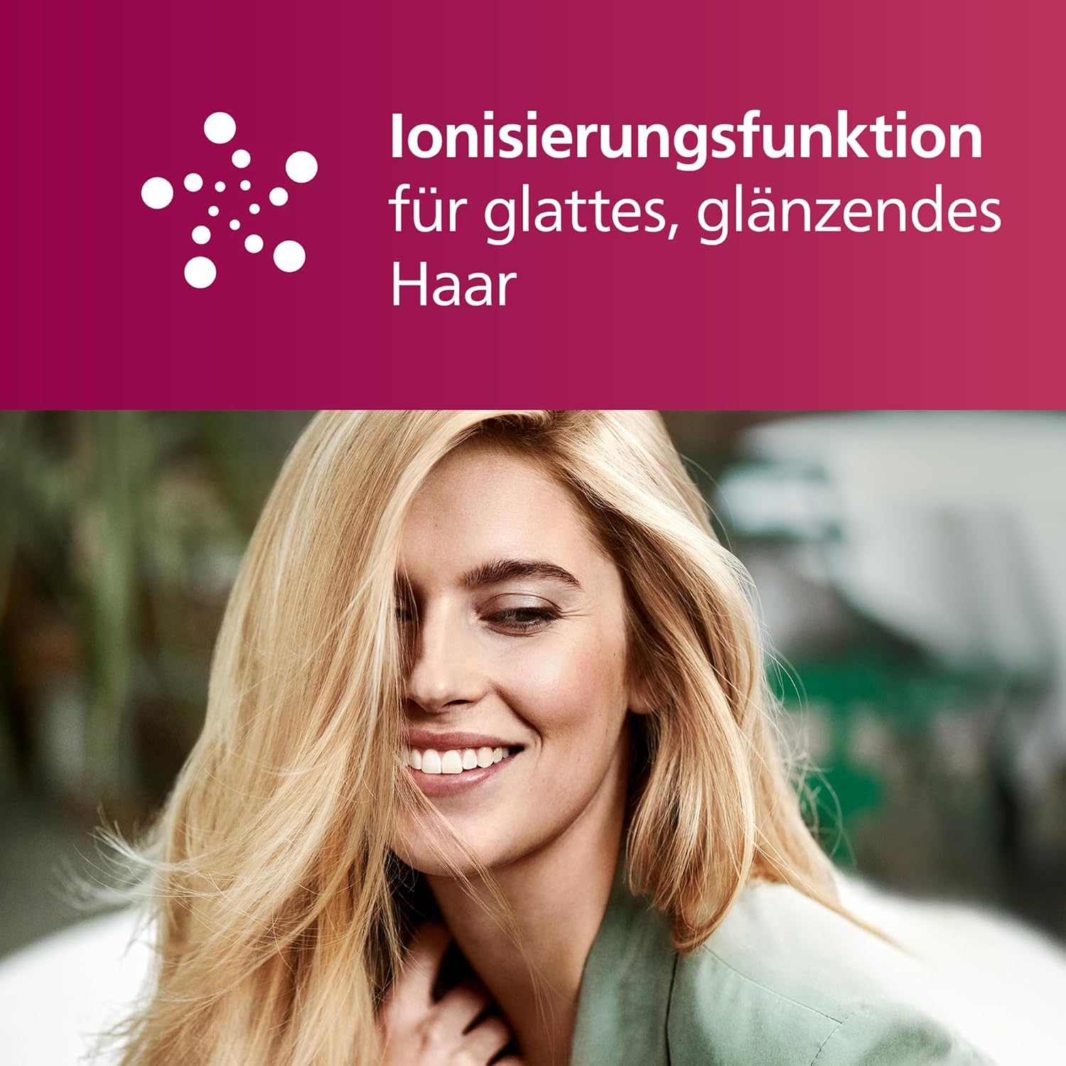 - Geniessen Sie glattes und glänzendes Haar mit dem Philips Haartrockner mit Ionisierungsfunktion: Die Ionisierungsfunktion nutzt negativ geladene Ionen, pflegt das Haar und glättet bis in die Schuppenschicht, um den Glanz des Haars zu intensivieren.