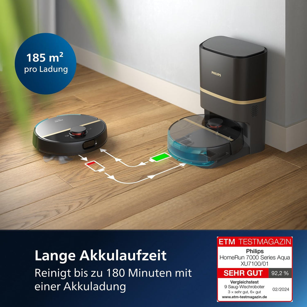 - Lange Akkulaufzeit: Dank des leistungsstarken 5.200-mAh-Li-Ion-Akkus kann der Roboter mit einer einzigen Ladung bis zu 180 Minuten oder über 185 m² reinigen. Er kehrt zum Aufladen automatisch zur Station zurück und setzt die Reinigung danach fort