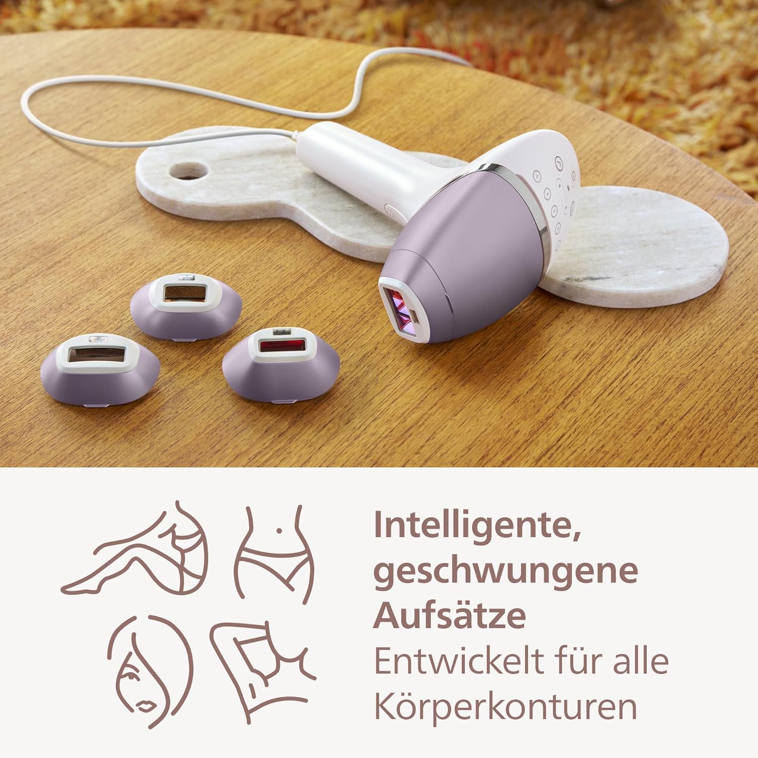 - Inhalt: Philips Lumea Prestige IPL-Gerät, Korrekturtrimmer, 4 Aufsätze, Netzteil und Luxus-Tasche