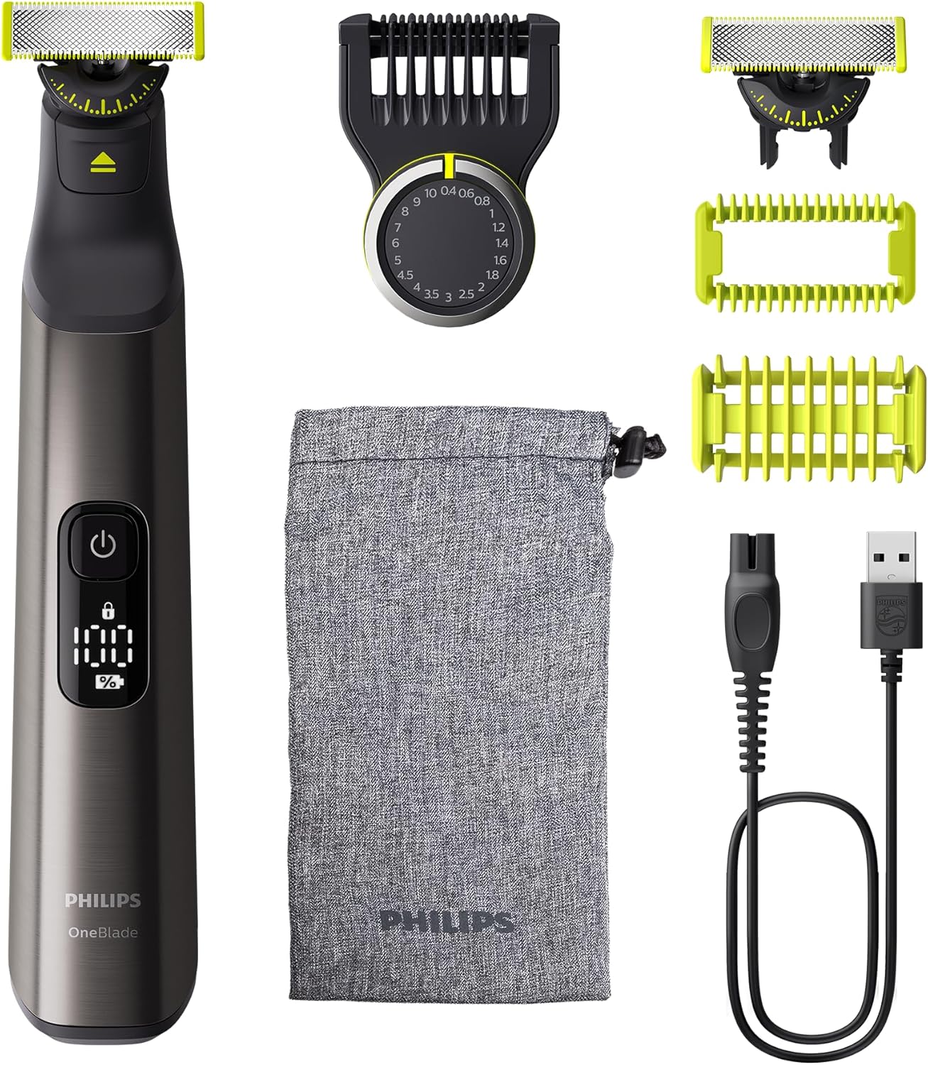 - Das Set enthält: 1x Philips OneBlade Pro 360 Face & Body, 2x 360 Klingen, 1x Präzisionskamm mit 20 Klingenlängen (0,4-10 mm), 1x Body Kit (1x Click-on-Körperkamm und 1x Hautschutz), 1x Schutzkappe