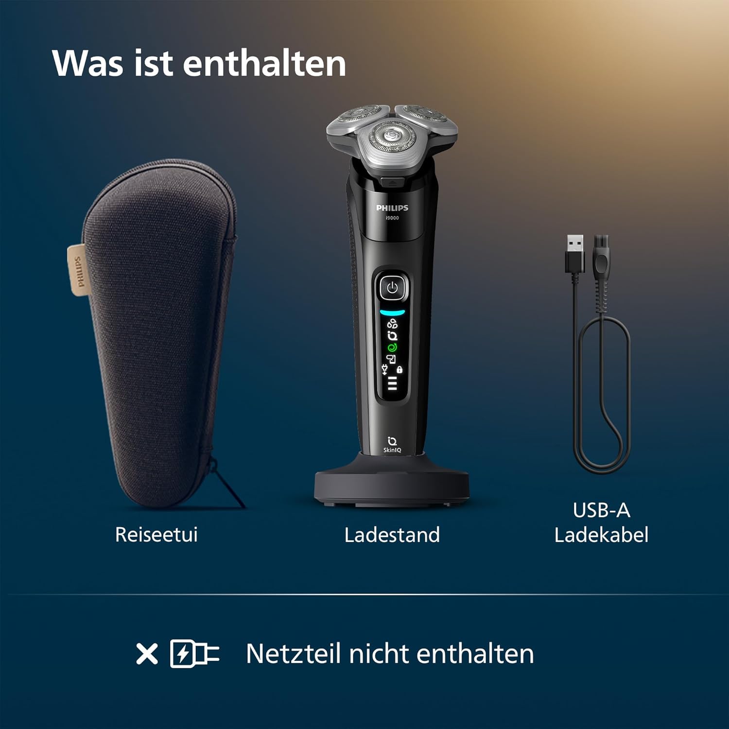 - Das Set beinhaltet: 1x Rasierer i9000, 1x Ladestation, 1x Reiseetui, 1x Reinigungsbürste, 1x USB-A Kabel; Netzteil nicht im Lieferumfang enthalten