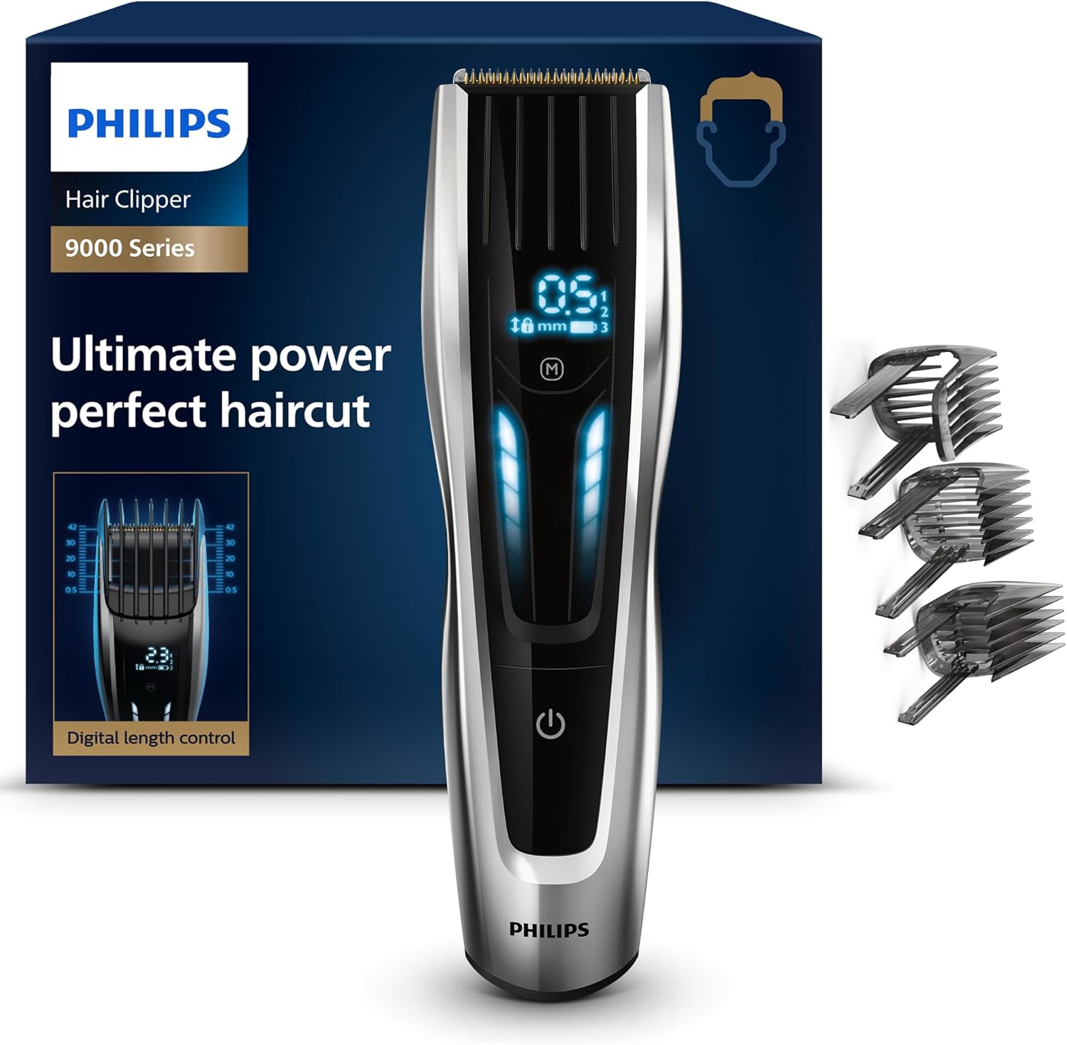 - Lieferumfang: Series 9000 Haarschneider, 3 Kammaufsätze, Tasche, Ladeständer und Benutzerhandbuch