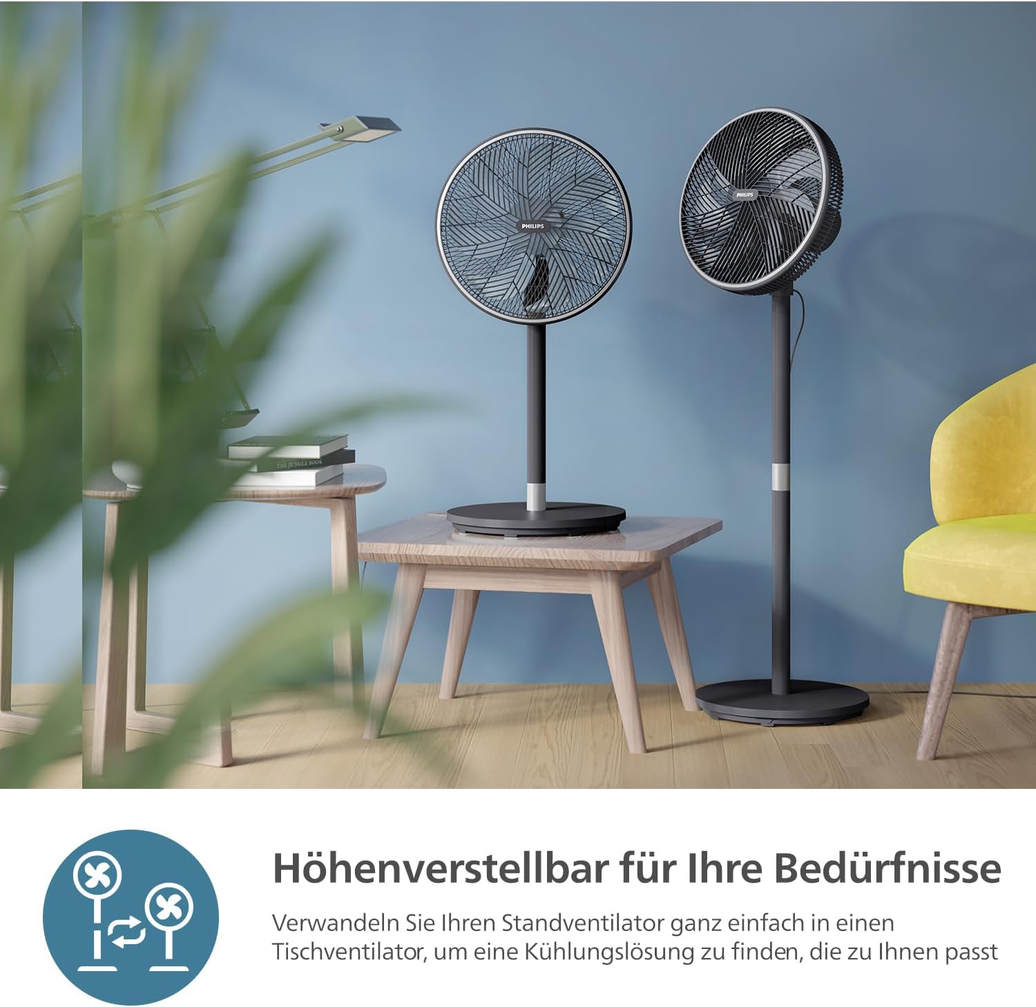 - Elegantes & vielseitiges Design: Er bietet 2-in-1 Tisch- oder Sockelhöhen, die zu Ihrer Umgebung passen, und kombiniert die Leistung eines grösseren Ventilators mit einem modernen, schlanken Design, das sich nahtlos in Ihr Zuhause einfügt
