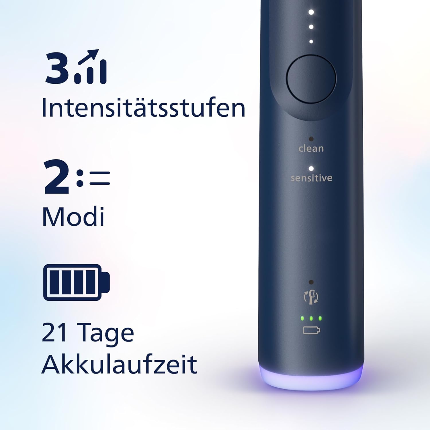 - Personalisieren Sie Ihre Reinigung und erreichen Sie Ihre Ziele im Bereich Mundhygiene mit 6 verschiedenen Einstellungen: Wählen Sie aus 2 Putzmodi und 3 Intensitätsstufen für eine Zahnputzroutine, die auf Ihre Bedürfnisse abgestimmt ist