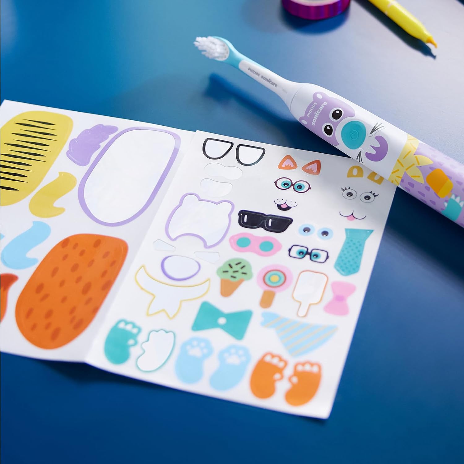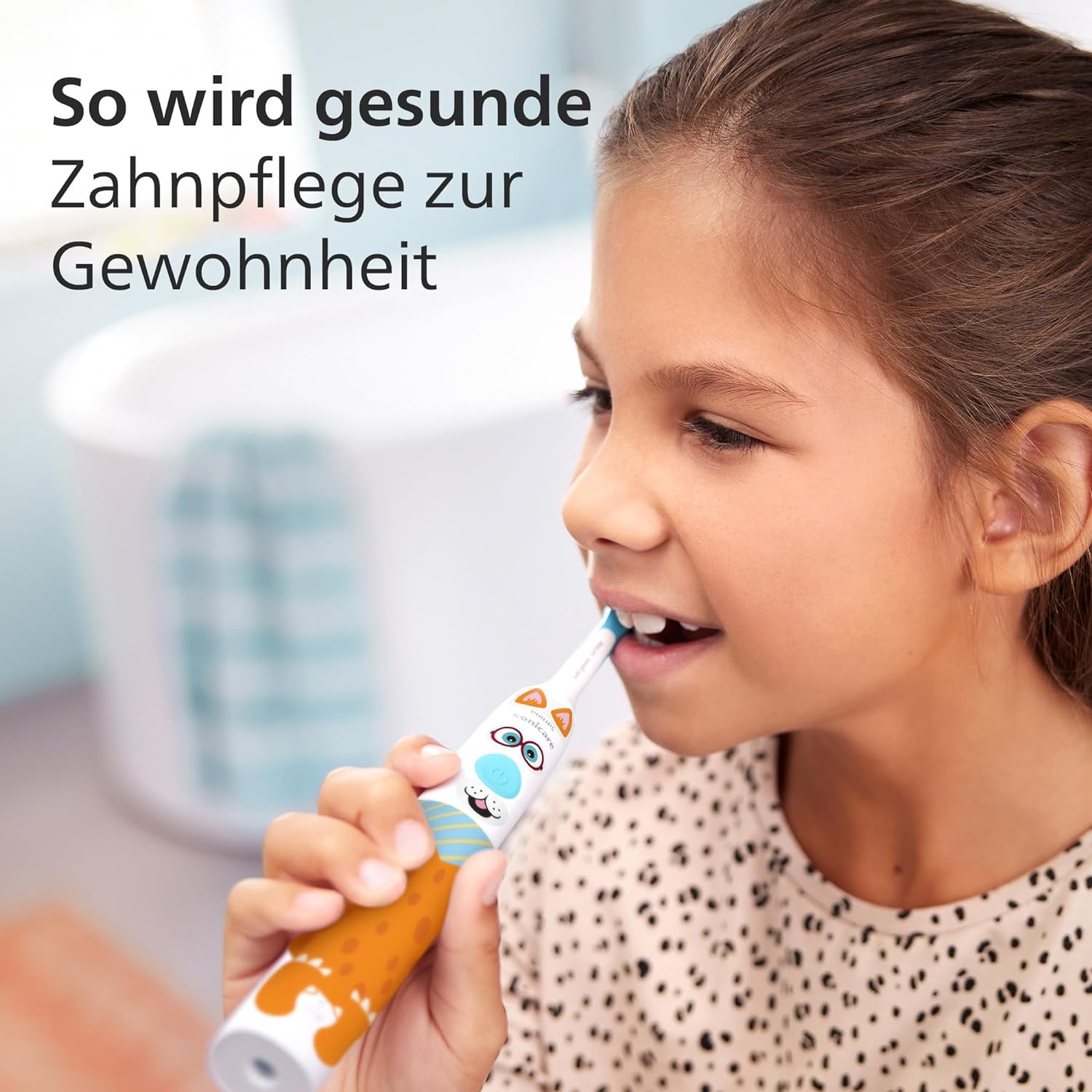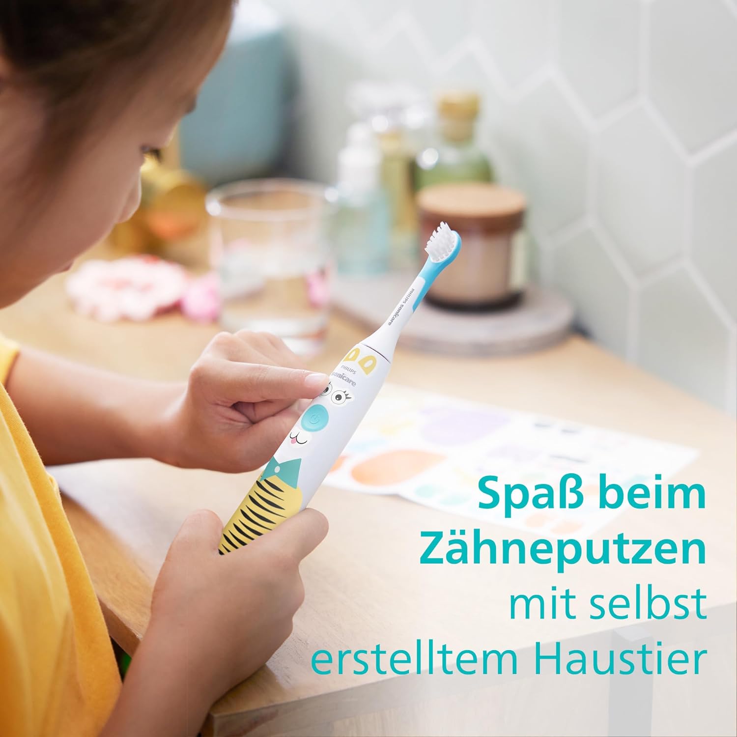 - Lieferumfang: 1 x Sonicare for Kids Handstück, 1 x Sonicare for Kids kompakter Bürstenkopf, 1 x USB-Ladegerät (Netzadapter nicht enthalten), 1x Reiseetui und wiederverwendbare Aufkleber der Design a Pet Edition