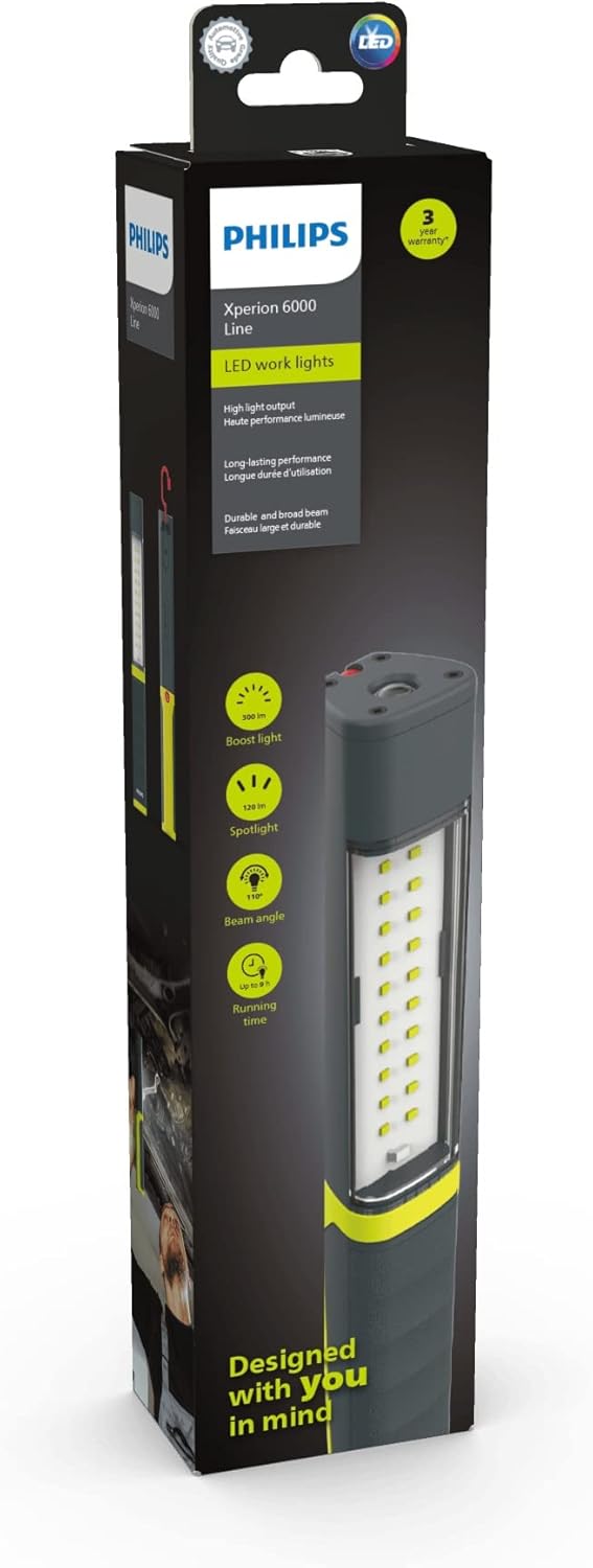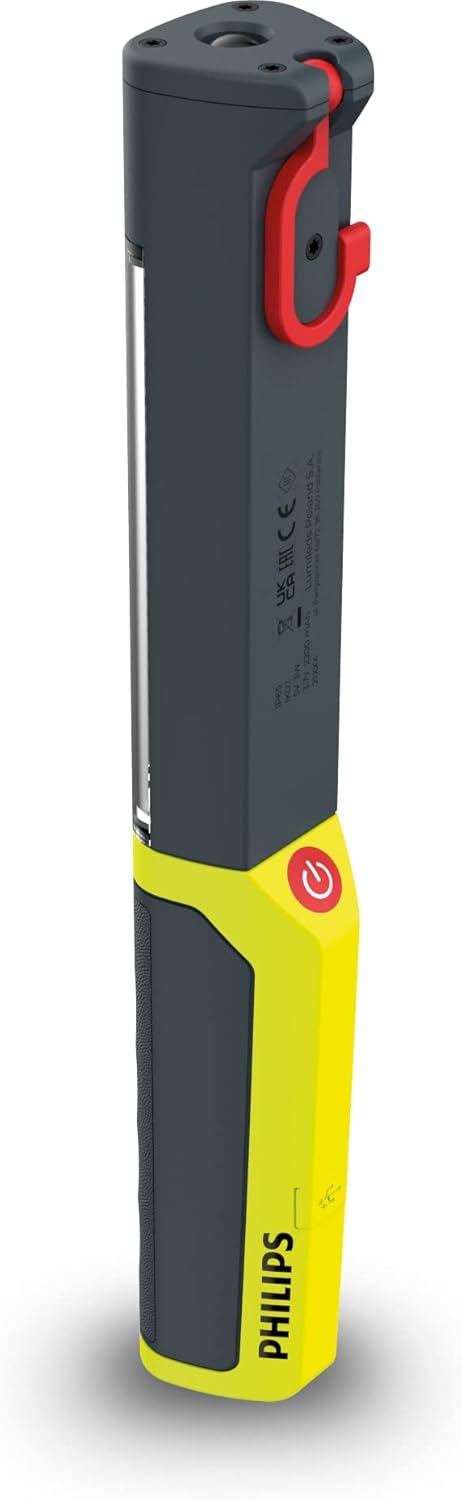 - Starker gummierter Magnet im Fuss und ein um 360° drehbarer Haken für freihändiges Arbeiten, stoss- und wasserfest (IP65/IK07), widerstandsfähig gegen Lösungsmittel