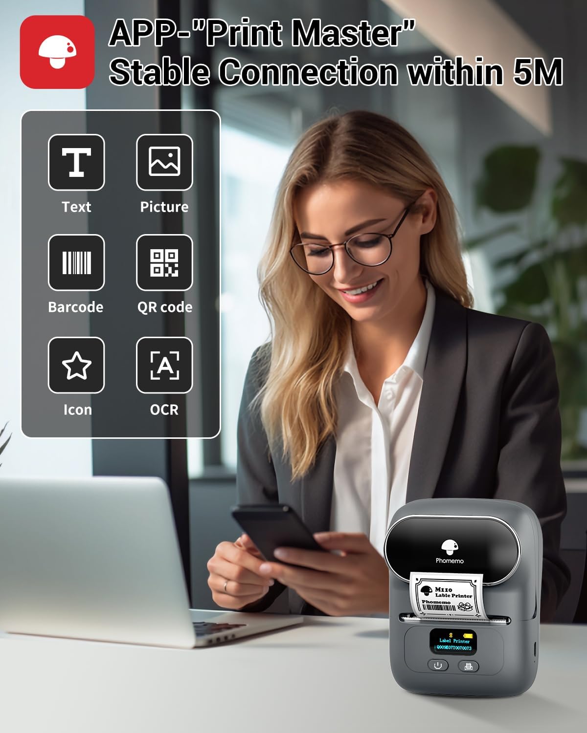 - Einfacher Etikettendruck - Der Phomemo M110 Thermoetikettendrucker verfügt über mehr als 300 Vorlagen in der App, mit denen Sie Ihre Etiketten bearbeiten und beschriften können. Bearbeiten Sie Ihre Etiketten in der Print Master"-App, verbinden Sie