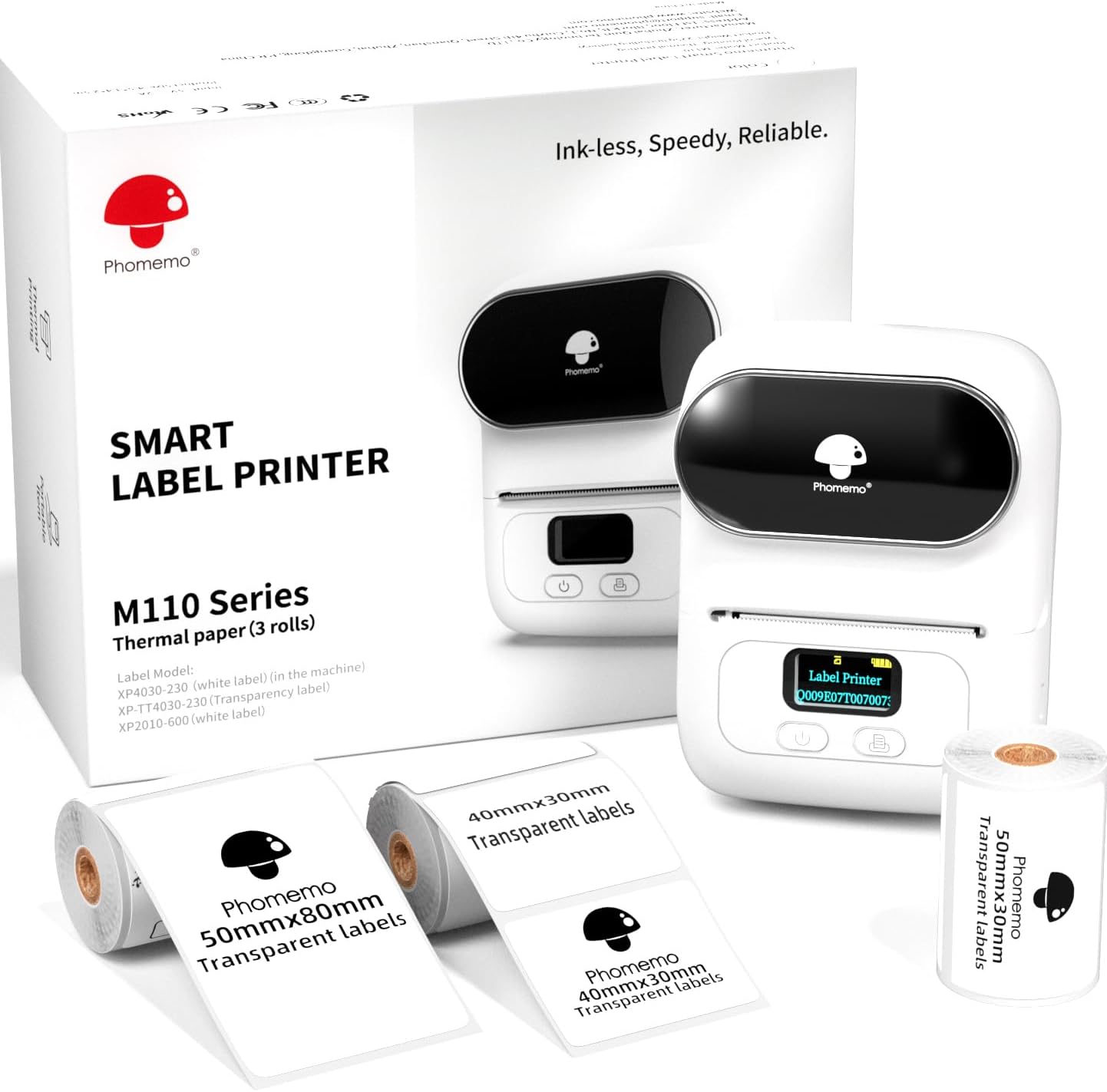• Phomemo M110 Bluetooth Etikettendrucker mit 3 Rollen Etikett Geschenkbox Sie erhalten - 1 x M110 Etikettendrucker weiss, 1 Rolle 40x30mm weiss Etiketten , 50x30mm weiss Etiketten , 50x80mm . Die Etiketten sind wasser- und ölbeständig, lassen sich