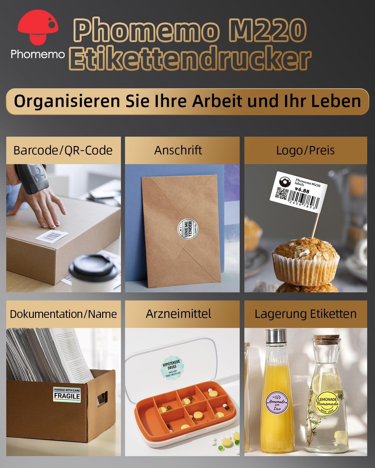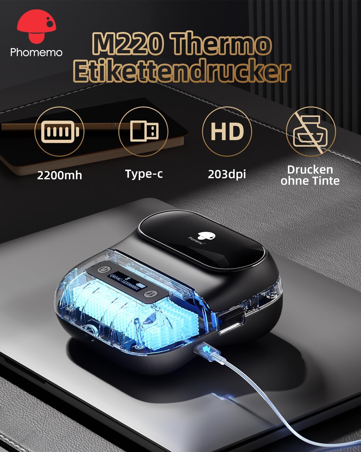 Phomemo M220 Etikettendrucker Beschriftungsgerät, Thermo Bluetooth Tragbarer Etikettenhersteller, Ak