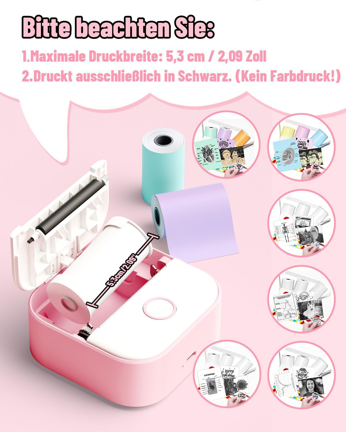 - Lustige Geschenke: T02 mini drucker kann verwendet werden, um Schwarz-Weiss-Fotos zu drucken, um Haftnotizen, Sammelalben, Notizen, Etiketten und etc. zu machen.Diese Aufkleber Maker Maschine kann die Kreativität der Kinder und Eltern-Kind-Aktivitäten