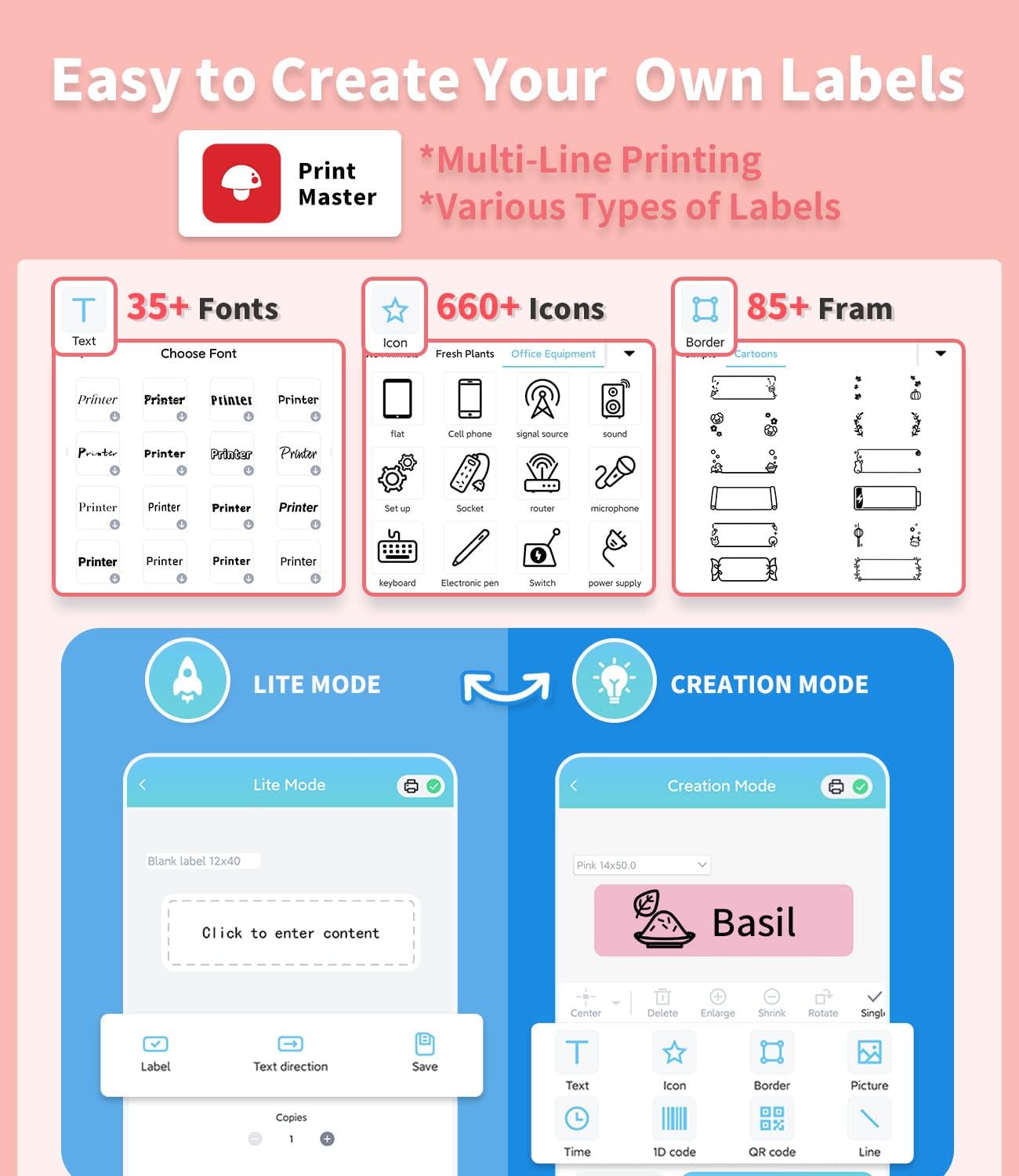 - Praktische Beschriftungsbearbeitung: Bearbeiten Sie über die App "Print Master", um mehr Möglichkeiten und Komfort im Vergleich zu herkömmlichen Tastaturen zu bieten. Verschiedene Schriftarten und Symbole stehen zur Verfügung, um ideale Effekte zu
