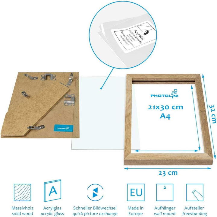 - MASSIVHOLZ-BILDERRAHMEN im zeitlosen schlichten Design. Farbe Eiche Optik, Oberfläche glatt, Schnitt geradlinig, mit ACRYLGLASSCHEIBE und stabiler Rückwand