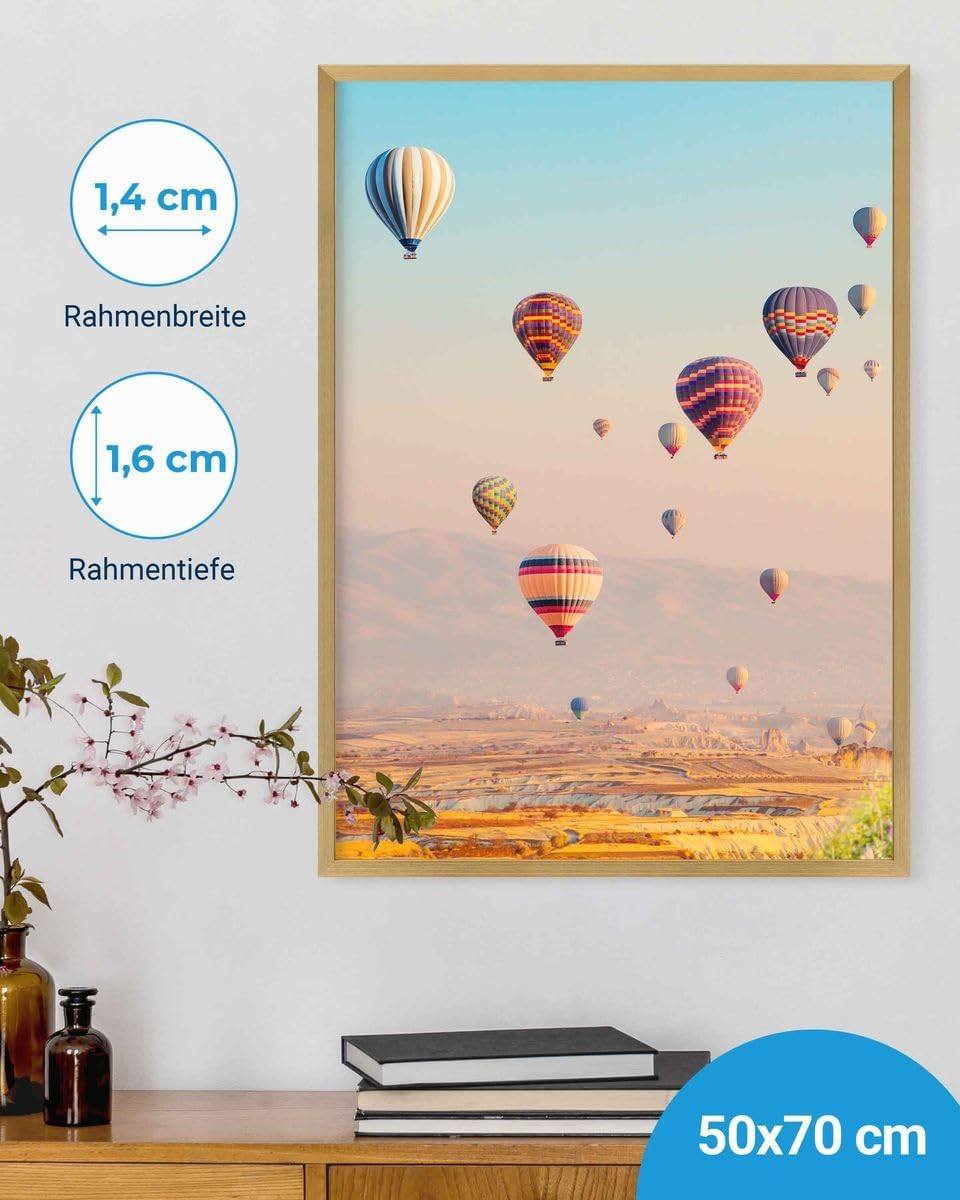- STILVOLL PRÄSENTIERT: 1 moderner Bilderrahmen in Gold aus stabilem MDF-Holz zum AUFHÄNGEN. Innenmass: 50x70 cm, sichtbarer Bild-Ausschnitt ca. 1 cm kleiner. Aussenmass: 52x72 cm.