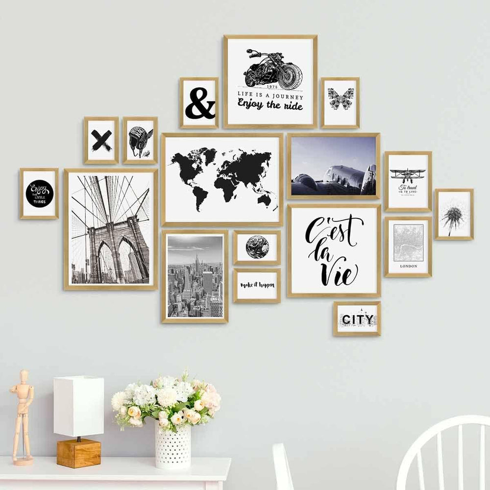 - STILVOLL PRÄSENTIERT: 17er Bilderrahmen Set gold Holz MDF zum AUFHÄNGEN. Bilderrahmen Wand Collage Set 5x 10x15, 4x 13x18, je 2x 15x20, 21x30, 30x30 und 30x40. Der sichtbare Bild-Ausschnitt des gold Bilderrahmen Set ist ca. 1 cm kleiner.